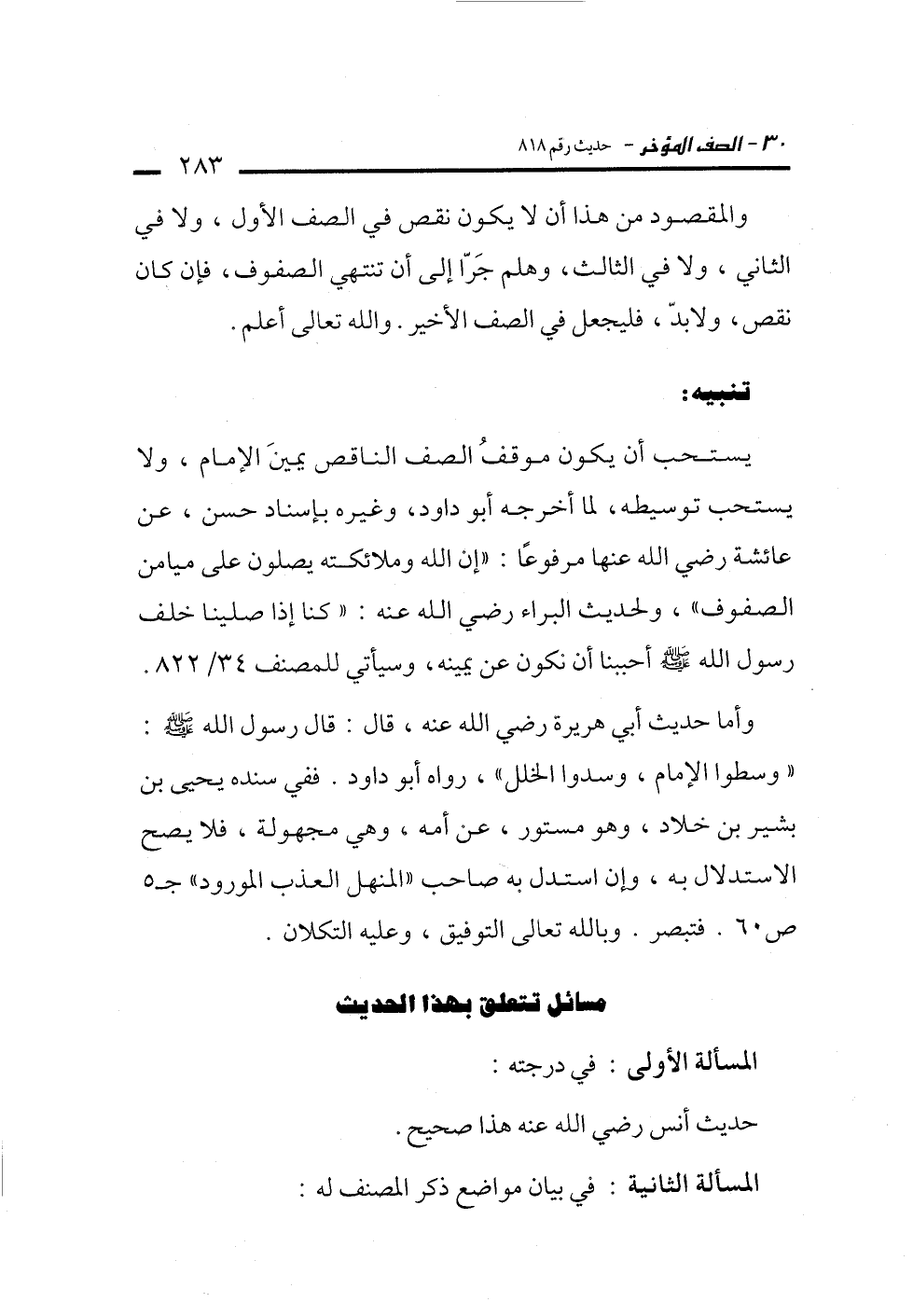 وأما حديث أبي هريرة رضي الله عنه، قال: قال رسول الله -صلى الله عليه وسلم-: "وسطوا الإمام، وسدوا الخلل"، رواه أبو داود. ففي سنده يحيى بن بشيربن خلاد، وهو مستور، عن أمه وهي مجهولة، فلا يصح الاستدلال به، وإن استدل له صاح "المنهل العذب" المورود" جـ 5 ص 60. فتبصر. وبالله تعالى التوفيق، وعليه التكلان.
