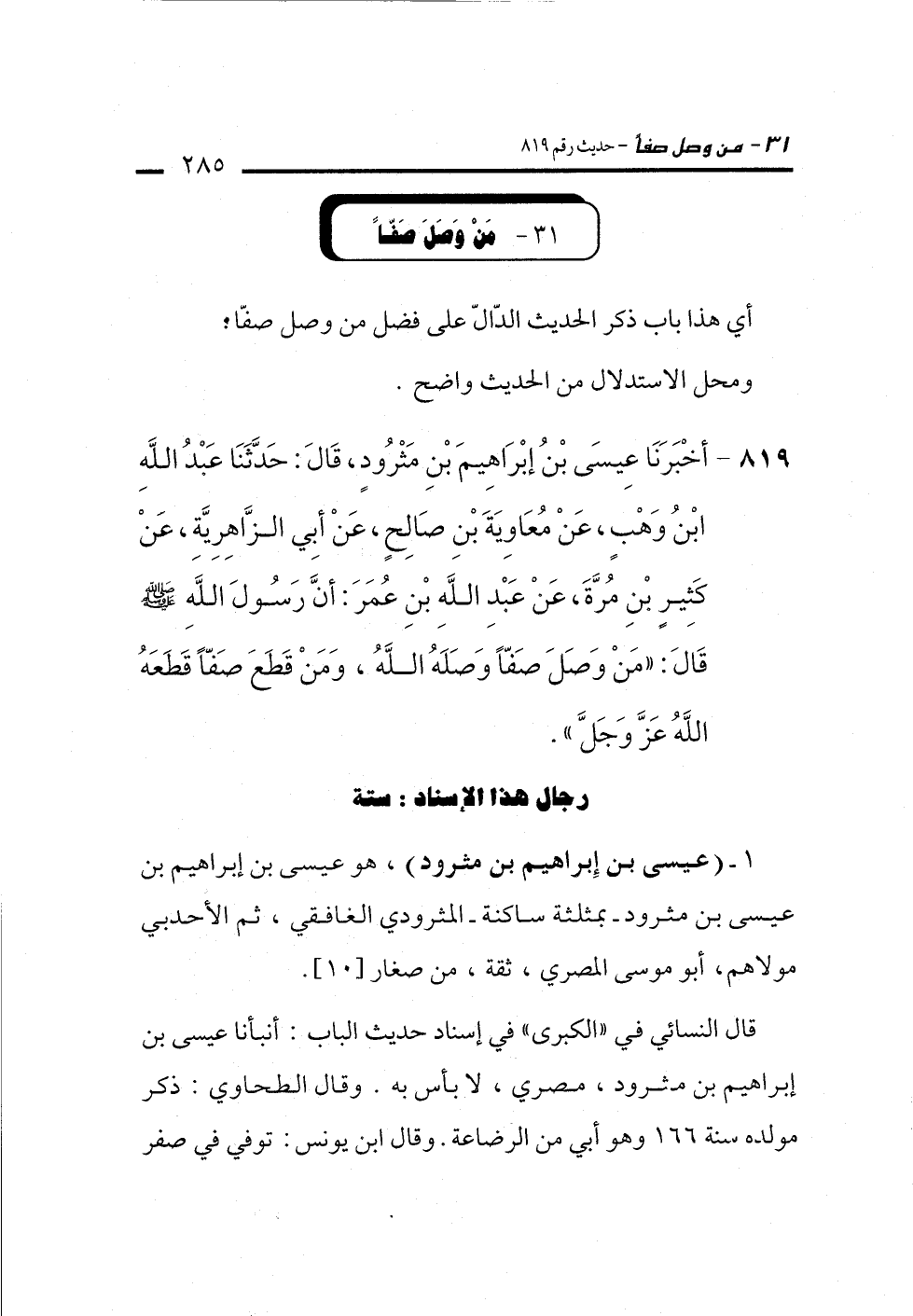 819 - أَخْبَرَنَا عِيسَى بْنُ إِبْرَاهِيمَ بْنِ مَثْرُودٍ، قَالَ: حَدَّثَنَا عَبْدُ اللَّهِ بْنُ وَهْبٍ، عَنْ مُعَاوِيَةَ بْنِ صَالِحٍ، عَنْ أَبِي الزَّاهِرِيَّةِ، عَنْ كَثِيرِ بْنِ مُرَّةَ، عَنْ عَبْدِ اللَّهِ بْنِ عُمَرَ: أَنَّ رَسُولَ اللَّهِ -صلى الله عليه وسلم- قَالَ: "مَنْ وَصَلَ صَفًّا وَصَلَهُ اللَّهُ، وَمَنْ قَطَعَ صَفًّا قَطَعَهُ اللَّهُ عَزَّ وَجَلَّ".