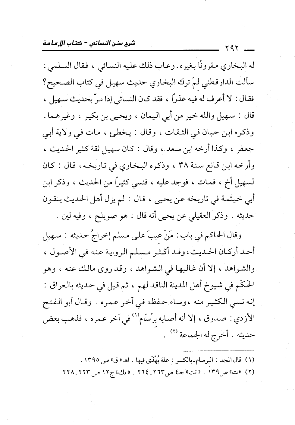 له البخاري مقرونًا بغيره. وعاب ذلك عليه النسائي، فقال السلمي: سألت الدارقطني لِمَ ترك البخاري حديث سهيل في كتاب الصحيح؟ فقال: لا أعرف له فيه عذرًا، فقد كان النسائي إذا مر بحديث سهيل، قال: سهيل والله خير من أبي اليمان، ويحيى بن بكير، وغيرهما. وذكره ابن حبان في الثقات، وقال: يخطىء، مات في ولاية أبي جعفر، وكذا أرخه ابن سعد، وقال: كان سهيل ثقة كثير الحديث، وأرخه ابن قانع سنة 38، وذكره البخاري في تاريخه، قال: كان لسهيل أخ، فمات، فوجد عليه، فنسي كثيرًا من الحديث، وذكر ابن أبي خيثمة في تاريخه عن يحيى، قال: لم يزل أهل الحديث يتقون حديثه، وذكر العقيلي عن يحيى أنه قال. هو صويلح، وفيه لين.