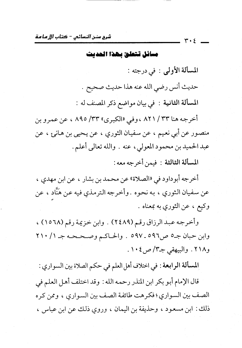 المسألة الرابعة: في اختلاف أهل العلم في حكم الصلاة بين السواري: قال الإمام أبو بكر ابن المنذر رحمه الله: وقد اختلف أهل العلم في الصف بين السواري؛ فكرهت طائفة الصف بين السواري، وممن كره ذلك: ابن مسعود، وحذيفة بن اليمان، وروي ذلك عن ابن عباس،