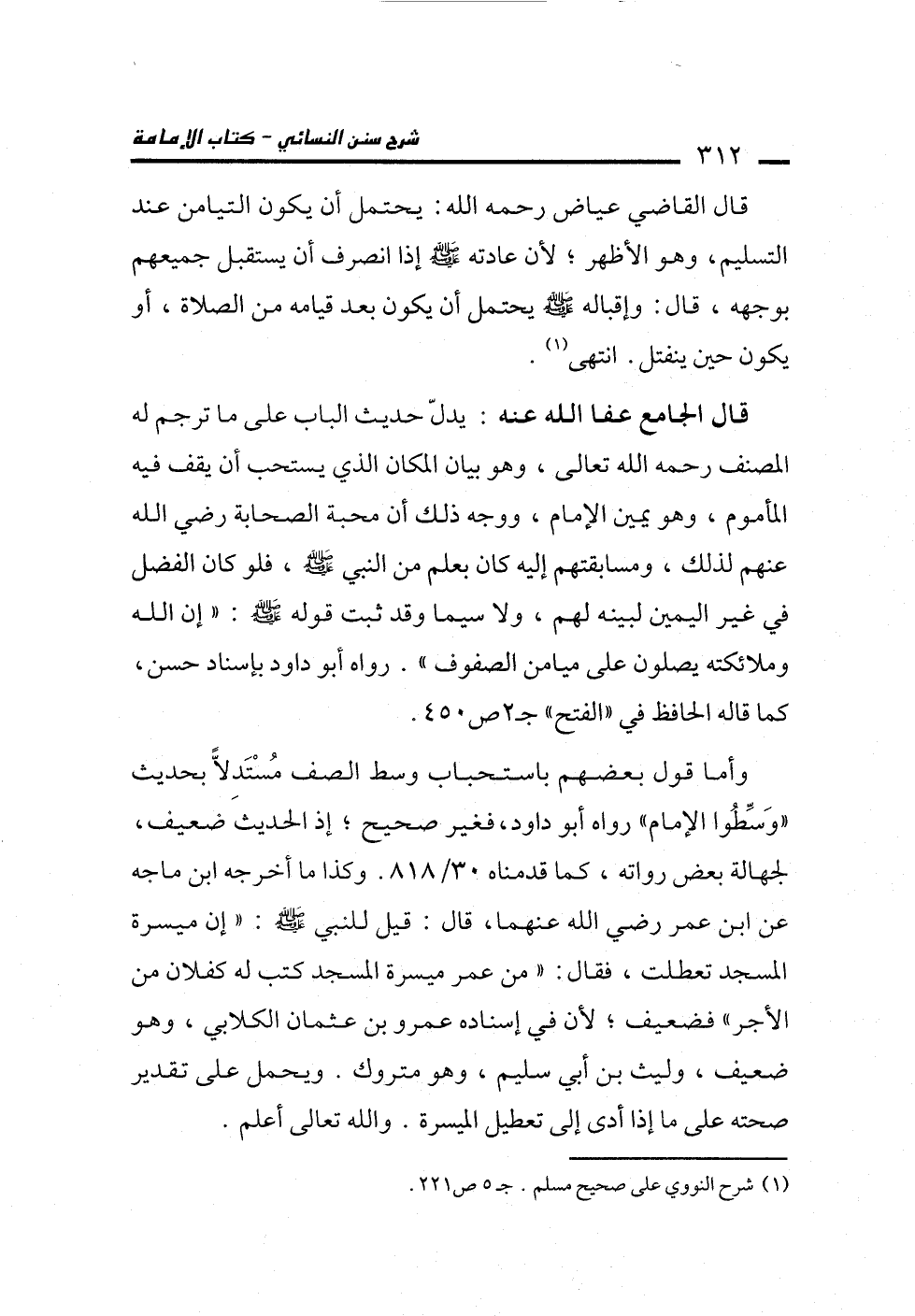 وأما قول بعضهم باستحباب وسط الصف مُسْتَدِلاًّ بحديث "وَسِّطُوا الإمام" رواه أبو داود، فغير صحيح؛ إذ الحديث ضعيف، لجهالة بعض رواته، كما قدمناه 30/ 818. وكذا ما أخرجه ابن ماجه عن ابن عمر رضي الله عنهما، قال: قيل للنبي -صلى الله عليه وسلم-: "إن ميسرة المسجد تعطلت، فقال: "من عمر ميسرة المسجد كتب له كفلان من الأجر" فضعيف؛ لأن في إسناده عمرو بن عثمان الكلابي، وهو ضعيف، وليث بن أبي سليم، وهو متروك. ويحمل على تقدير صحته على ما إذا أدى إلى تعطيل الميسرة. والله تعالى أعلم.