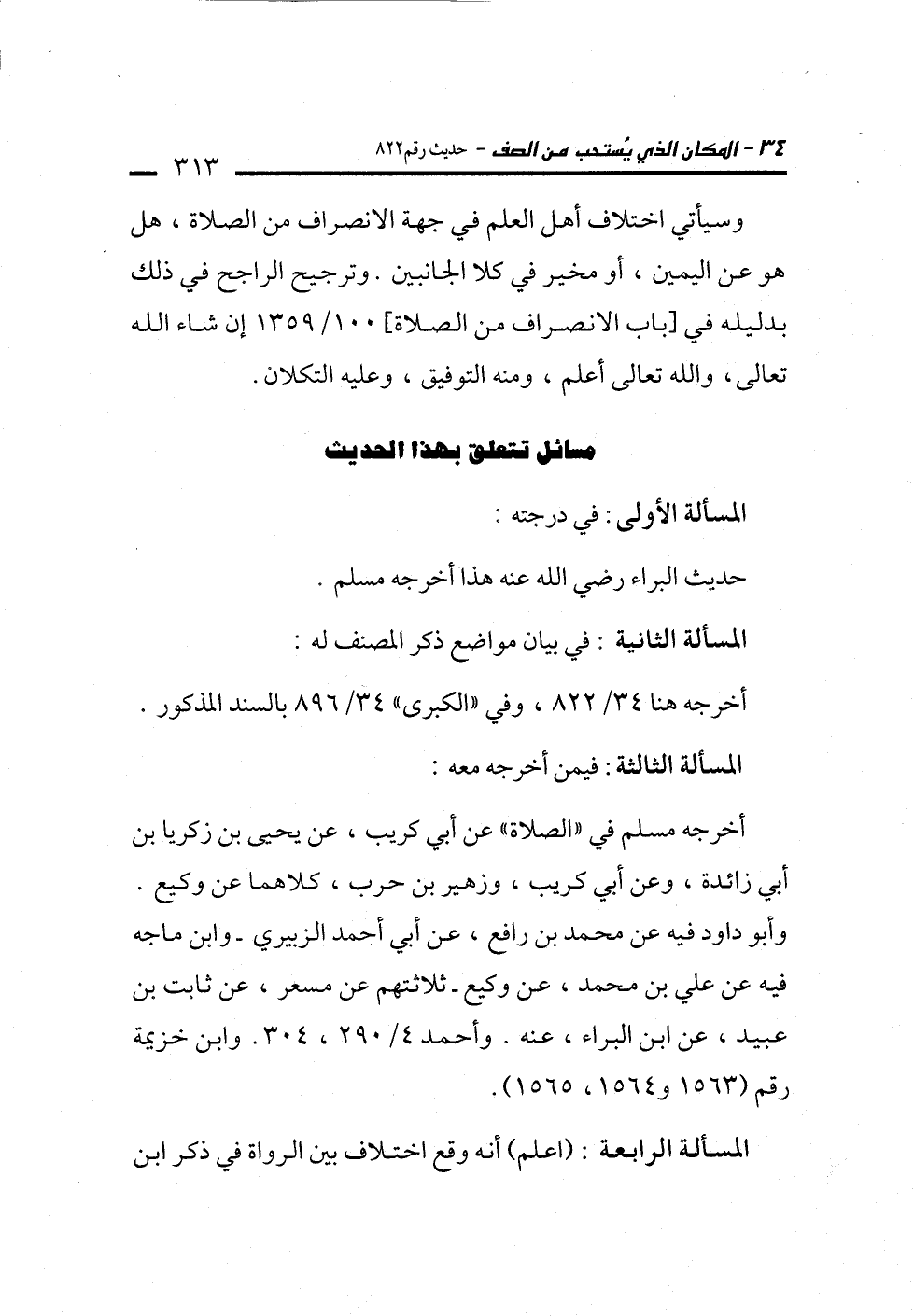 وسيأتي اختلاف أهل العلم في جهة الانصراف من الصلاة، هل هو عن اليمين، أو مخير في كلا الجانبين. وترجيح الراجح في ذلك بدليله في [باب الانصراف من الصلاة] 100/ 1359 إن شاء الله تعالى، والله تعالى أعلم، ومنه التوفيق، وعليه التكلان.