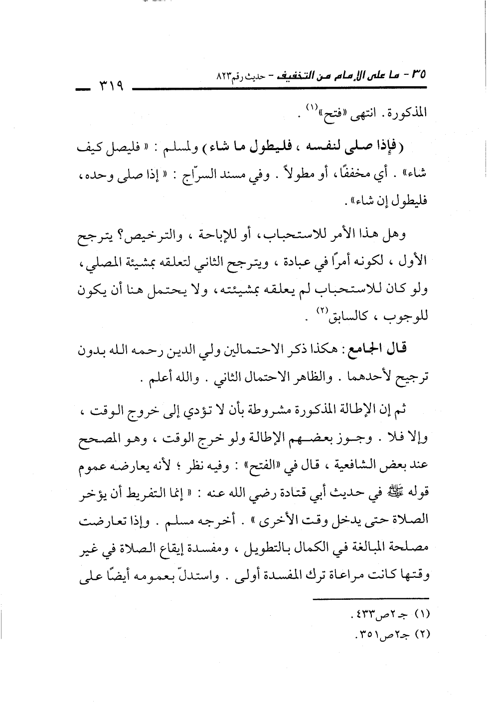 قال الجامع: هكذا ذكر الاحتمالين ولي الدين رحمه الله بدون ترجيح لأحدهما. والظاهر الاحتمال الثاني. والله أعلم.