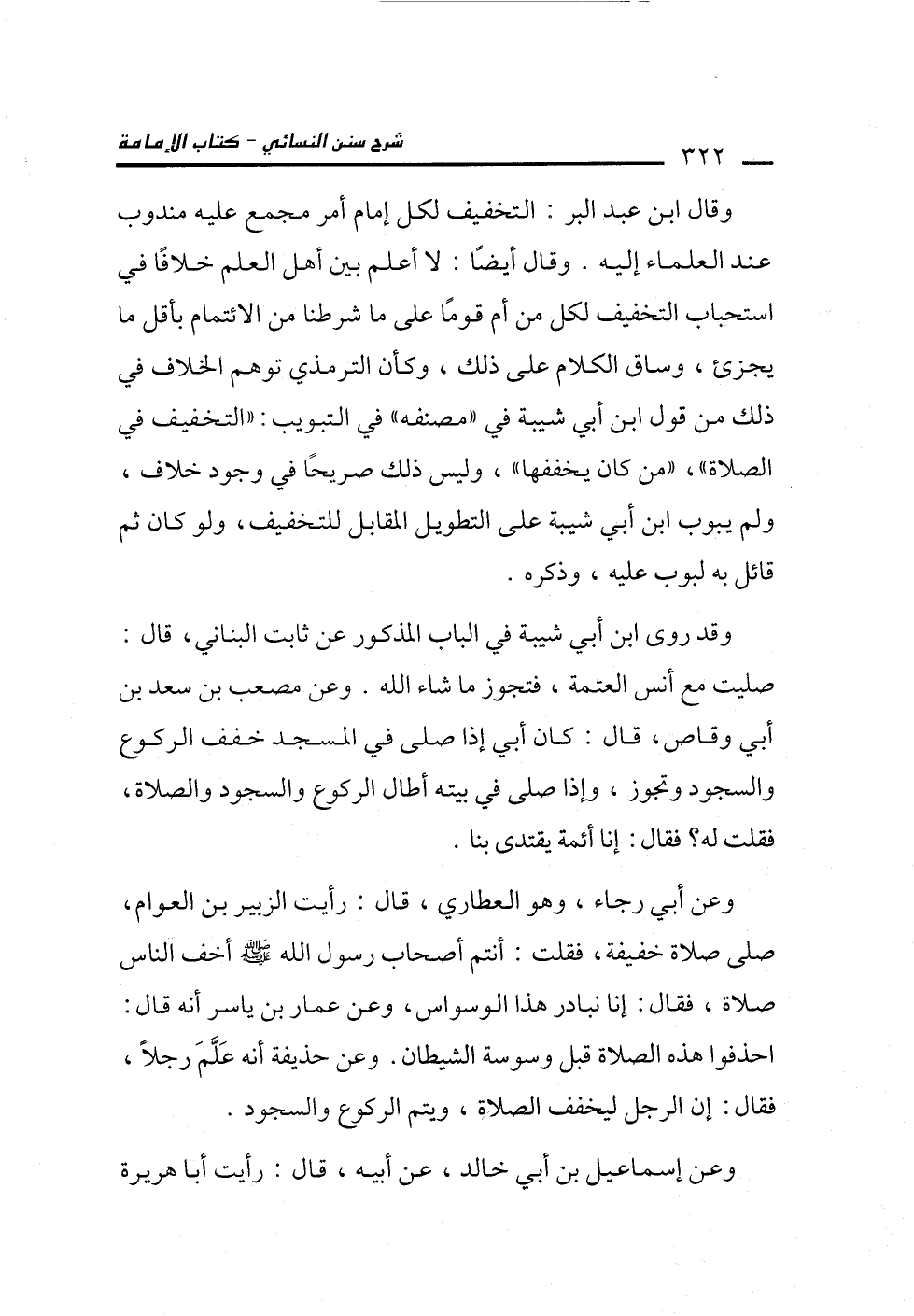 وقال ابن عبد البر: التخفيف لكل إمام أمر مجمع عليه مندوب عند العلماء إليه. وقال أيضّاً: لا أعلم بين أهل العلم خلافًا في استحباب التخفيف لكل من أم قومًا على ما شرطنا من الائتمام بأقل ما يجزىء، وساق الكلام على ذلك، وكأن الترمذي توهم الخلاف في ذلك من قول ابن أبي شيبة في "مصنفه" في التبويب: "التخفيف في الصلاة"، "من كان يخففها"، وليس ذلك صريحًا في وجود خلاف، ولم يبوب ابن أبي شيبة على التطويل المقابل للتخفيف، ولو كان ثم قائل به لبوب عليه، وذكره.