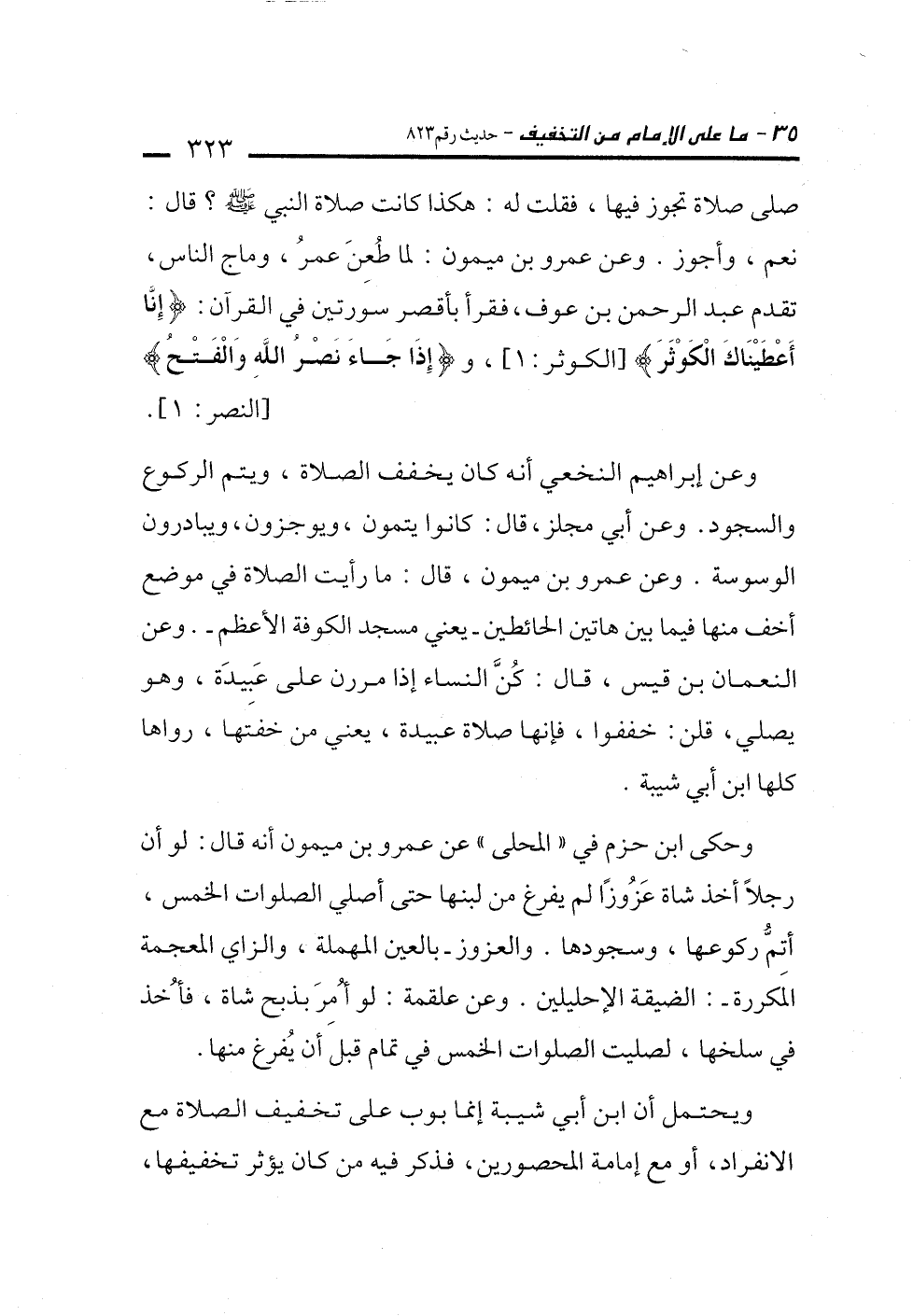 وعن إبراهيم النخعي أنه كان يخفف الصلاة، ويتم الركوع والسجود. وعن أبي مجلز، قال: كانوا يتمون، ويوجزون، ويبادرون الوسوسة. وعن عمرو بن ميمون، قال. ما رأيت الصلاة في موضع أخف منها فيما بين هاتين الحائطين -يعني مسجد الكوفة الأعظم-. وعن النعمان بن قيس، قال: كُنَّ النساء إذا مررن على عَبِيدَة، وهو يصلي، قلن: خففوا، فإنها صلاة عبيدة، يعني من خفتها، رواها كلها ابن أبي شيبة.