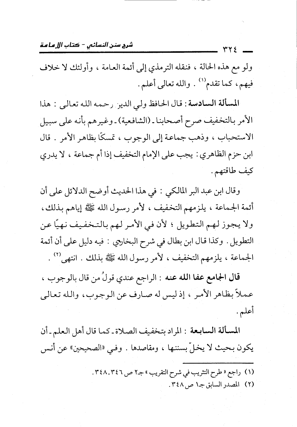 المسألة السادسة: قال الحافظ ولي الدين رحمه الله تعالى: هذا الأمر بالتخفيف صرح أصحابنا - (الشافعية) - وغيرهم بأنه على سبيل الاستحباب، وذهب جماعة إلى الوجوب، تمسكًا بظاهر الأمر. قال ابن حزم الظاهري: يجب على الإمام التخفيف إذا أم جماعة، لا يدري كيف طاقتهم.