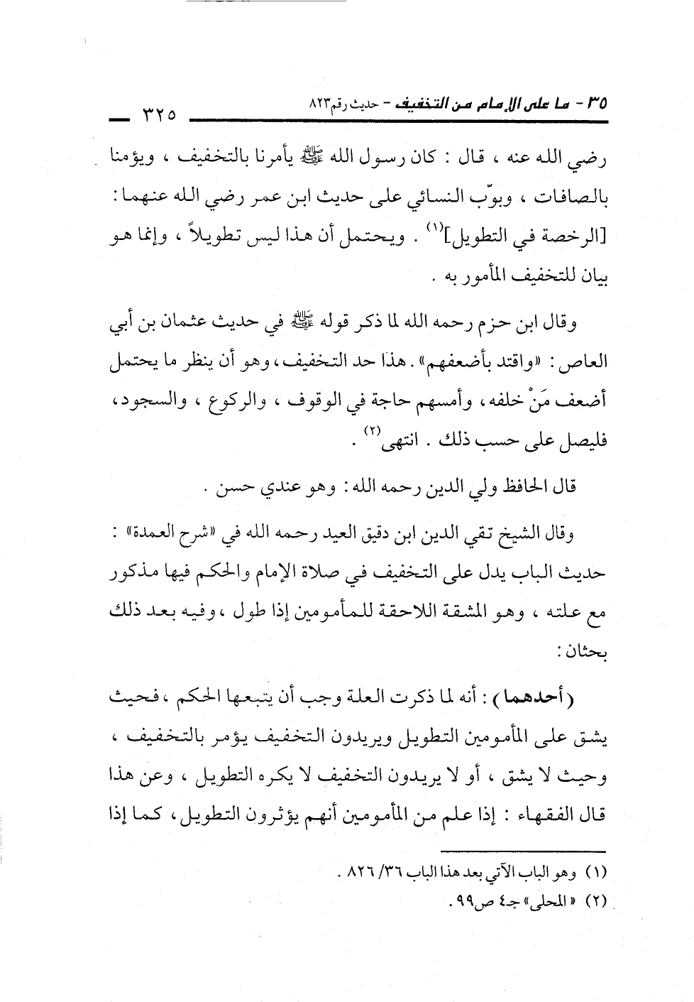 وقال ابن حزم رحمه الله لما ذكر قوله -صلى الله عليه وسلم- في حديث عثمان بن أبي العاص: "واقتد بأضعفهم". هذا حد التخفيف، وهو أن ينظر ما يحتمل أضعف مَنْ خلفه، وأمسهم حاجة في الوقوف، والركوع، والسجود، فليصل على حسب ذلك. انتهى (¬2).