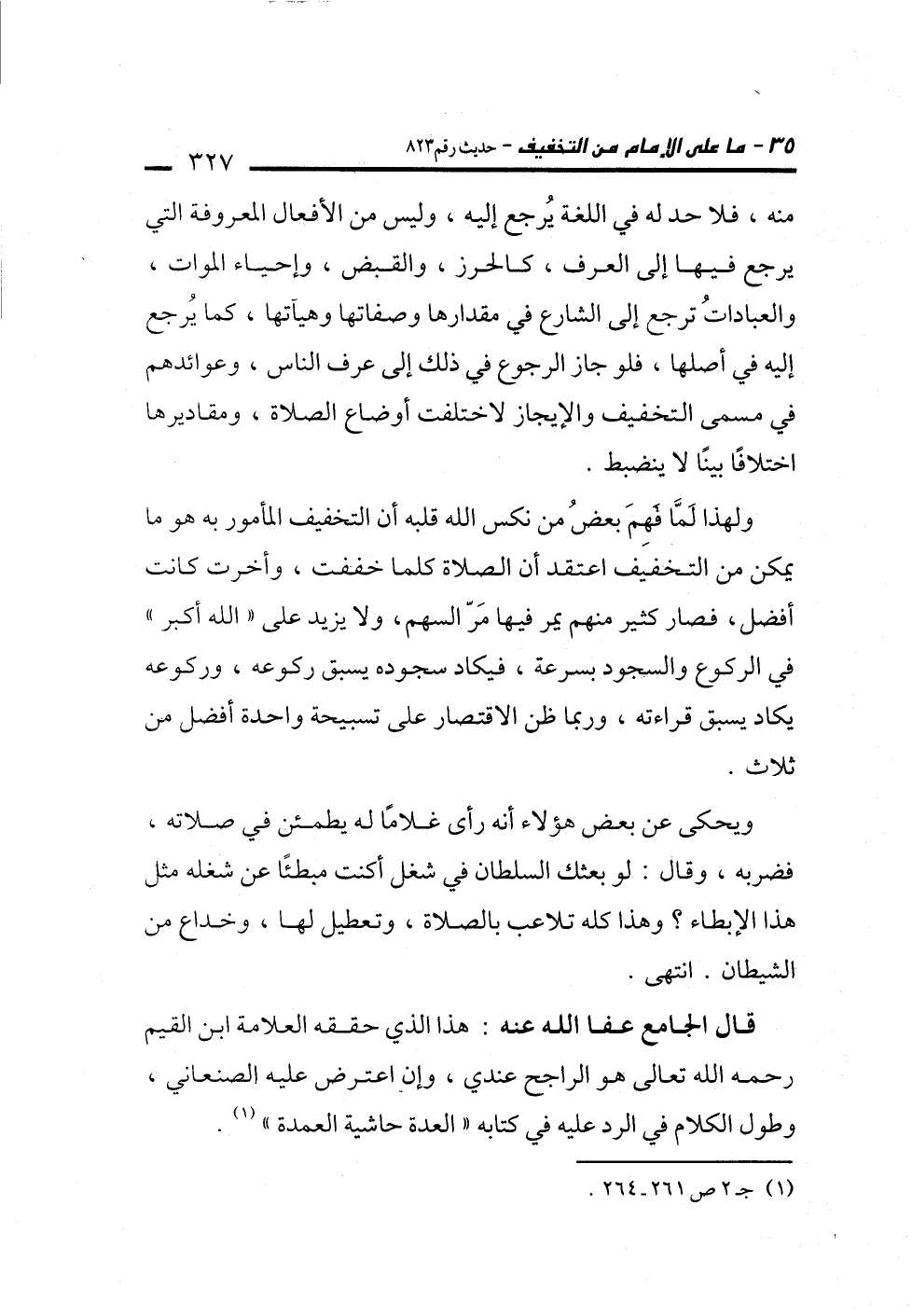 ولهذا لَمَّا فهِمَ بعضُ من نكس الله قلبه أن التخفيف المأمور به هو ما يمكن من التخفيف اعتقد أن الصلاة كلما خففت، وأخرت كانت أفضل، فصار كثير منهم يمر فيها مَرّ السهم، ولا يزيد على "الله أكبر" في الركوع والسجود بسرعة، فيكاد سجوده يسبق ركوعه، وركوعه يكاد يسبق قراءته، وربما ظن الاقتصار على تسبيحة واحدة أفضل من ثلاث.