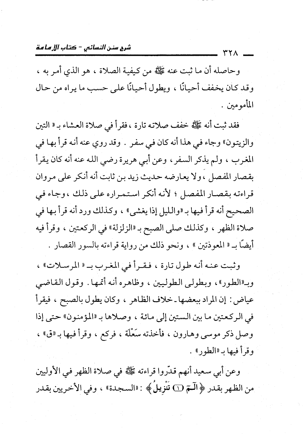 فقد ثبت أنه -صلى الله عليه وسلم- خفف صلاته تارة، فقرأ في صلاة العشاء بـ"التين والزيتون" وجاء في هذا أنه كان في سفر. وقد روي عنه أنه قرأ بها في المغرب، ولم يذكر السفر، وعن أبي هريرة رضي الله عنه أنه كان يقرأ بقصار المفصل، ولا يعارضه حديث زيد بن ثابت أنه أنكر على مروان قراءته بقصار المفصل، لأنه أنكر استمراره على ذلك، وجاء في الصحيح أنه قرأ فيها بـ"والليل إذا يغشى"، وكذلك ورد أنه قرأ بها في صلاة الظهر، وكذلك صلى الصبح بـ "الزلزلة" في الركعتين، وقرأ فيه أيضًا بـ"المعوذتين"، ونحو ذلك من رواية قراءته بالسور القصار.