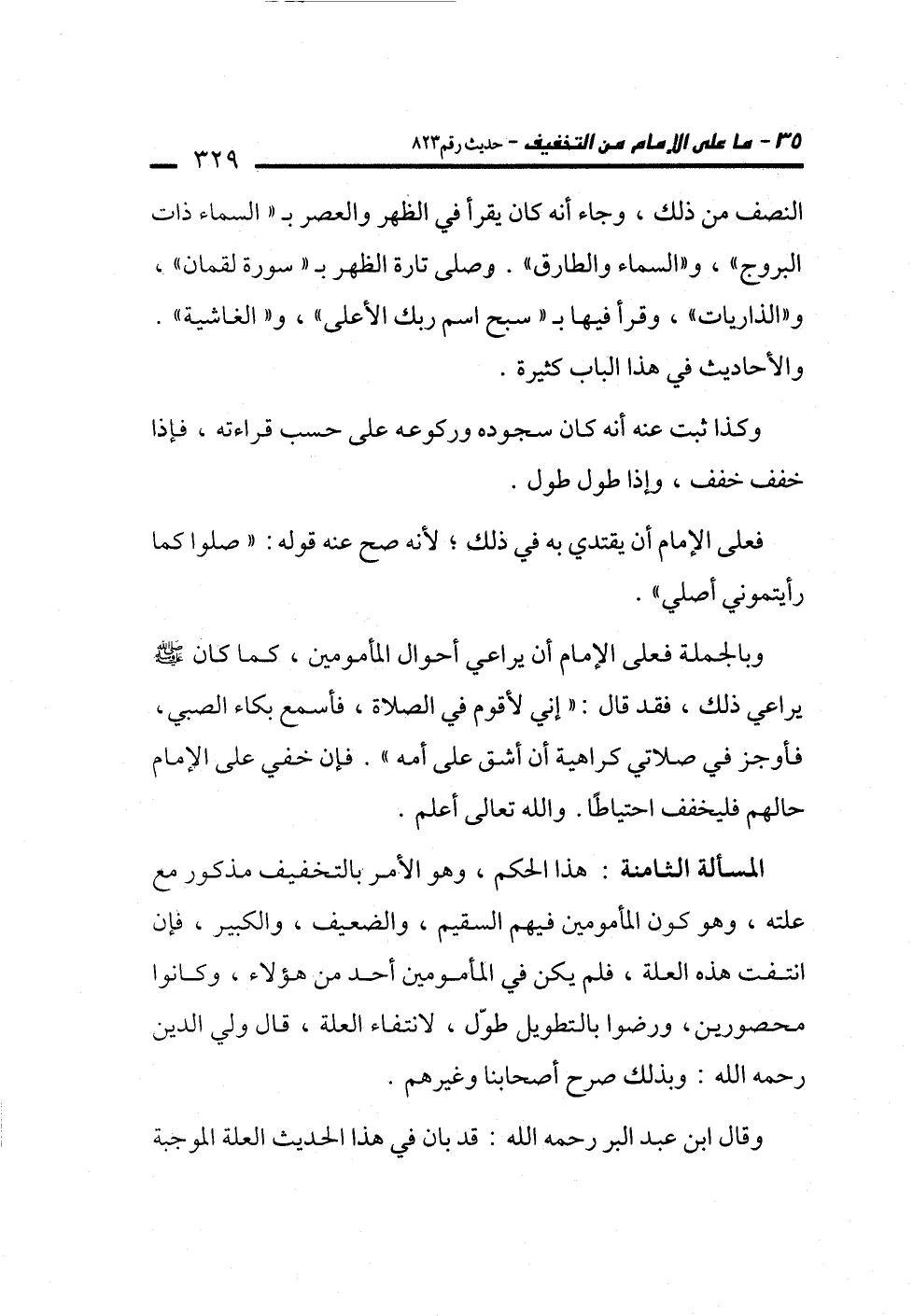 وبالجملة فعلى الإمام أن يراعي أحوال المأمومين، كما كان -صلى الله عليه وسلم- يراعي ذلك، فقد قال: "إني لأقوم في الصلاة، فأسمع بكاء الصبي، فأوجز في صلاتي كراهية أن أشق على أمه". فإن خفي على الإمام حالهم فليخفف احتياطًا. والله تعالى أعلم.