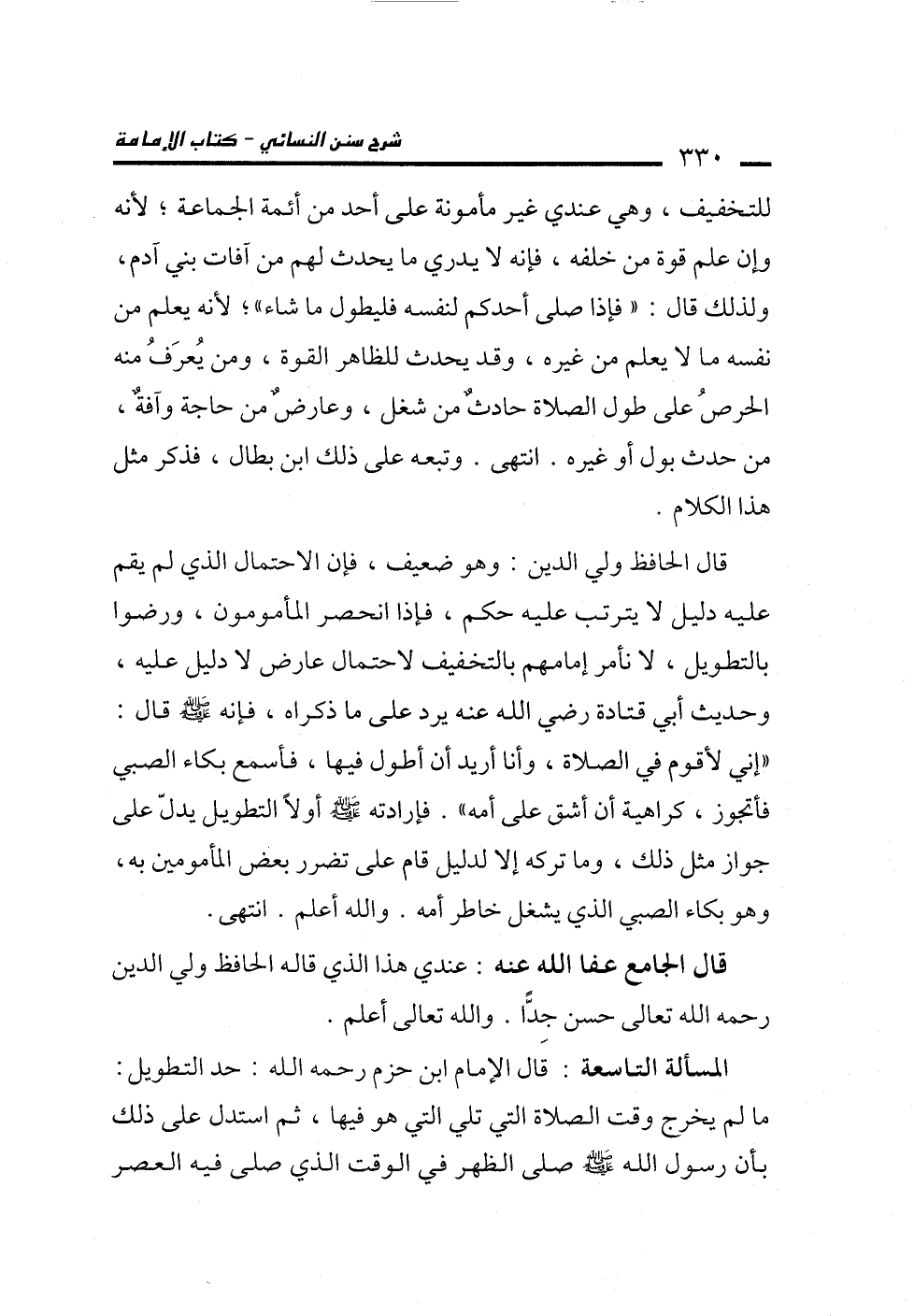 المسألة التاسعة: قال الإمام ابن حزم رحمه الله: حد التطويل: ما لم يخرج وقت الصلاة التي تلي التي هو فيها، ثم استدل على ذلك بأن رسول الله -صلى الله عليه وسلم- صلى الظهر في الوقت الذي صلى فيه العصر