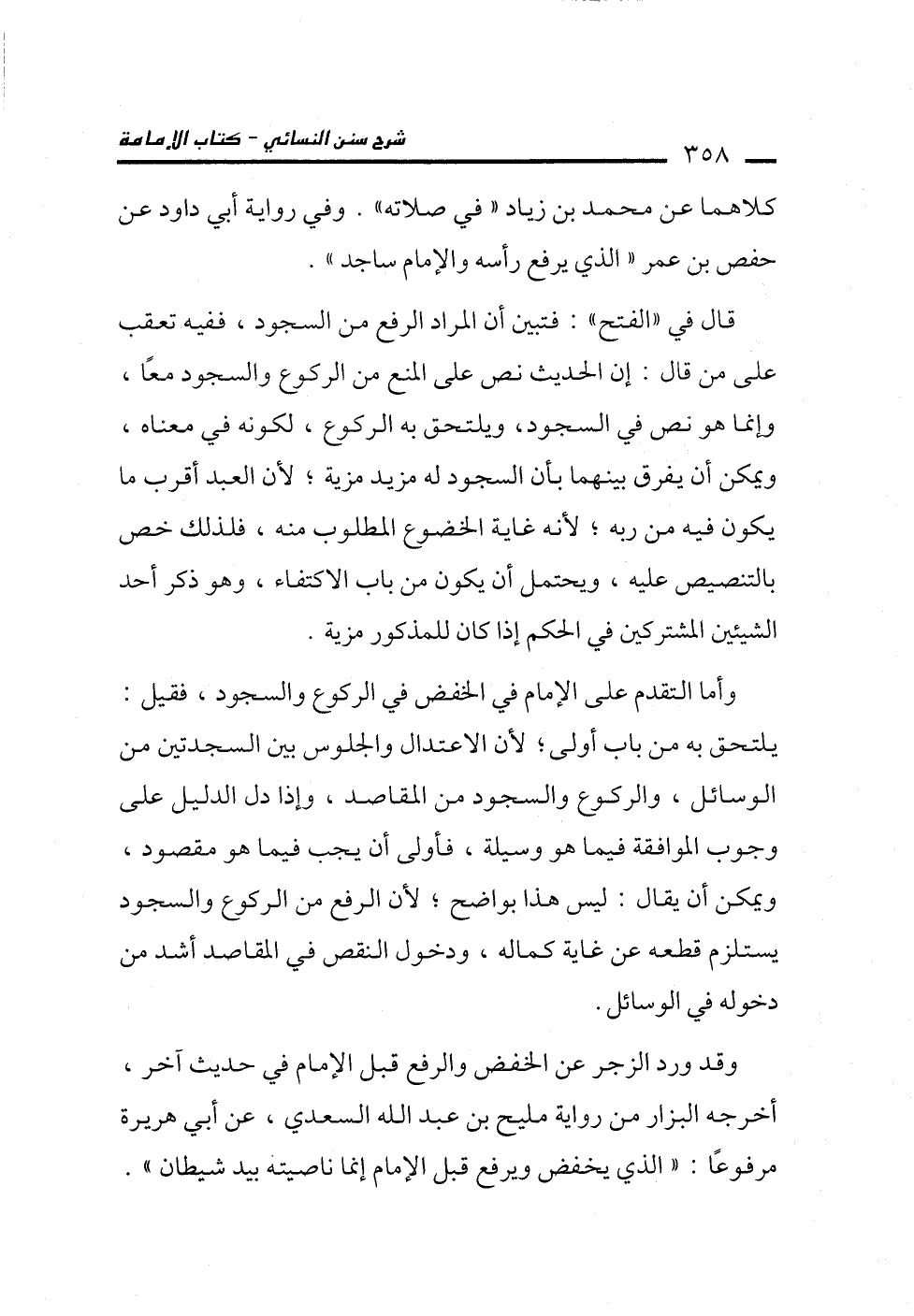 قال في "الفتح": فتبين أن المراد الرفع من السجود، ففيه تعقب على من قال: إن الحديث نص على المنع من الركوع والسجود معًا، وإنما هو نص في السجود، ويلتحق به الركوع، لكونه في معناه، ويمكن أن يفرق بينهما بأن السجود له مزيد مزية؛ لأن العبد أقرب ما يكون فيه من ربه؛ لأنه غاية الخضوع المطلوب منه، فلذلك خص بالتنصيص عليه، ويحتمل أن يكون من باب الاكتفاء، وهو ذكر أحد الشيئين المشتركين في الحكم إذا كان للمذكور مزية.
