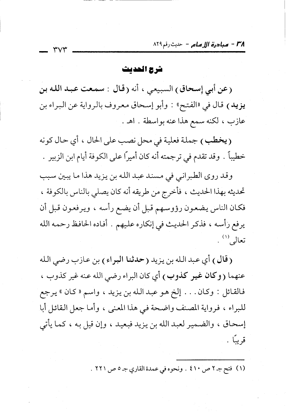 (عن أبي إِسحاق) السبيعي، أنه (قال: سمعت عبد الله بن يزيد) قال في "الفتح": وأبو إسحاق معروف بالرواية عن البراء بن عازب، لكنه سمع هذا عنه بواسطة. اهـ.