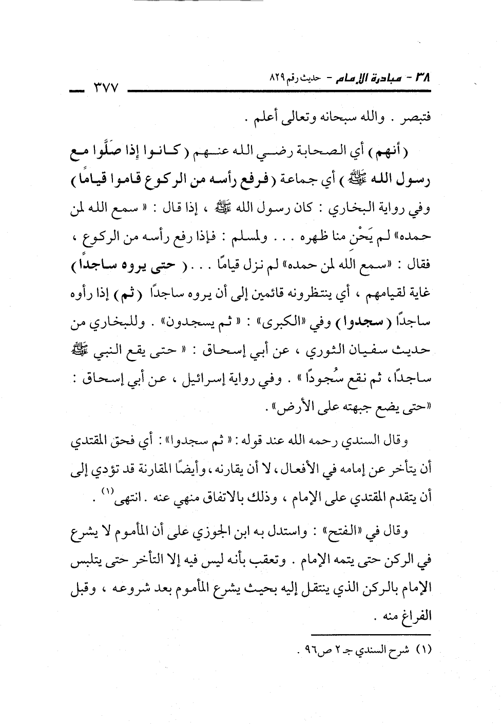 وقال في "الفتح": واستدل به ابن الجوزي على أن المأموم لا يشرع في الركن حتى يتمه الإمام. وتعقب بأنه ليس فيه إلا التأخر حتى يتلبس الإمام بالركن الذي ينتقل إليه بحيث يشرع المأموم بعد شروعه، وقبل الفراغ منه.