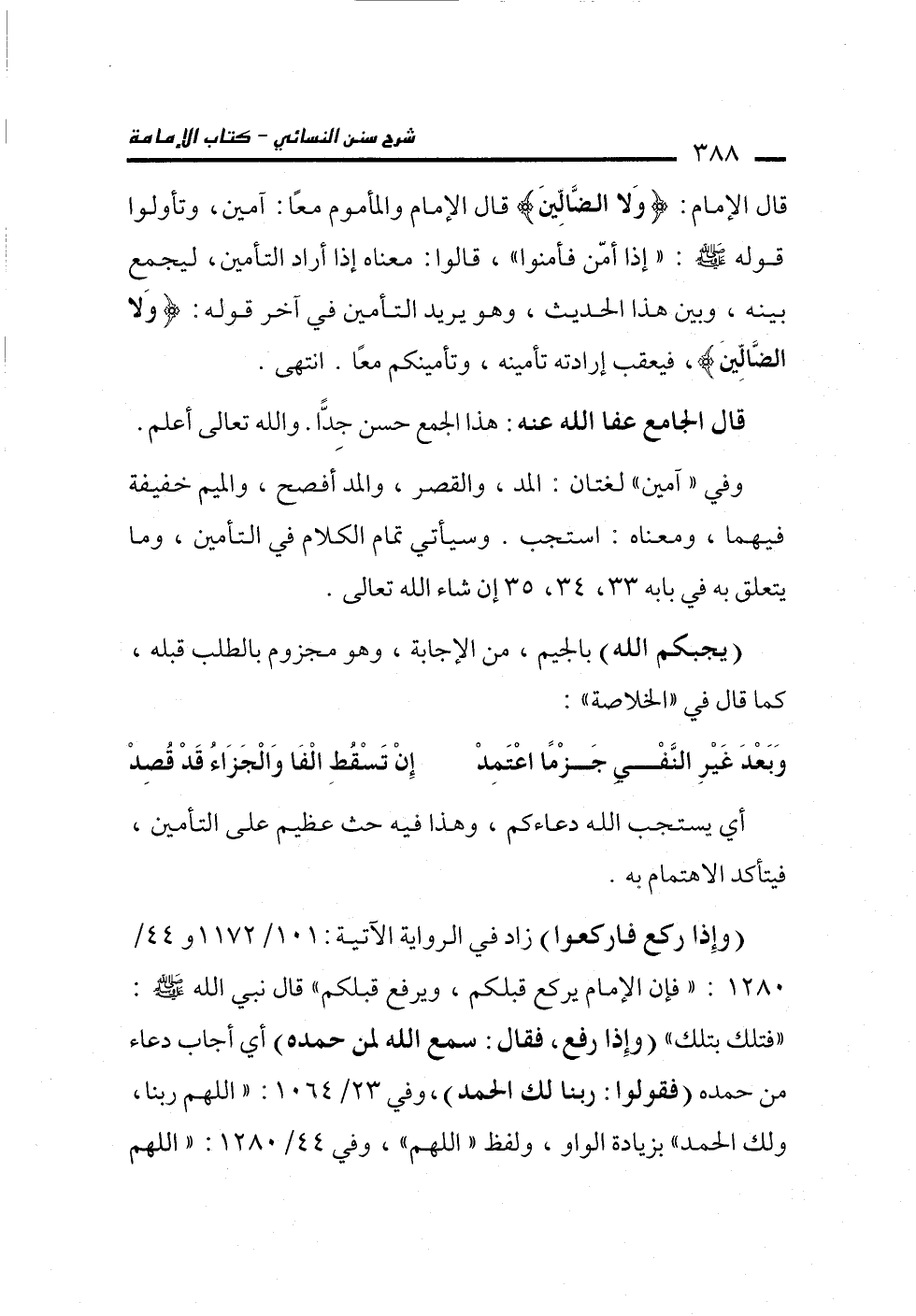 قال الإمام: {وَلَا الضَّالِّينَ} قال الإمام والمأموم معًا: آمين، وتأولوا قوله -صلى الله عليه وسلم-: "إذا أمّن فأمنوا"، قالوا: معناه إذا أراد التأمين، ليجمع بينه، وبين هذا الحديث، وهو يريد التأمين في آخر قوله: {وَلَا الضَّالِّينَ}، فيعقب إرادته تأمينه، وتأمينكم معًا. انتهى.
