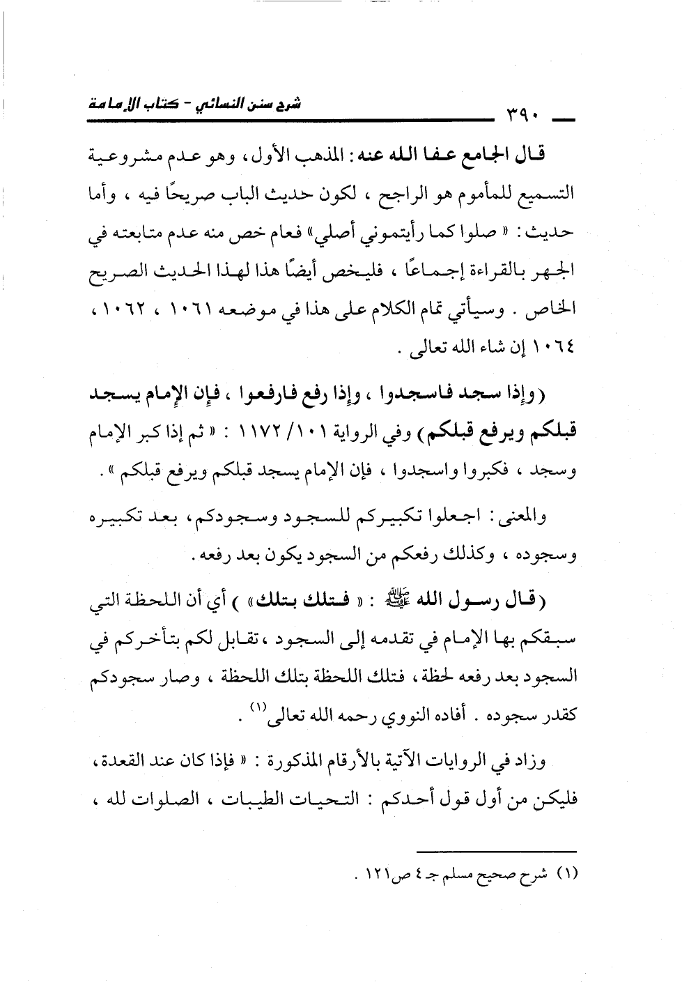 (وإِذا سجد فاسجدوا، وإِذا رفع فارفعوا، فإِن الإِمام يسجد قبلكم ويرفع قبلكم) وفي الرواية 101/ 1172: "ثم إذا كبر الإمام وسجد، فكبروا واسجدوا، فإن الإمام يسجد قبلكم ويرفع قبلكم".