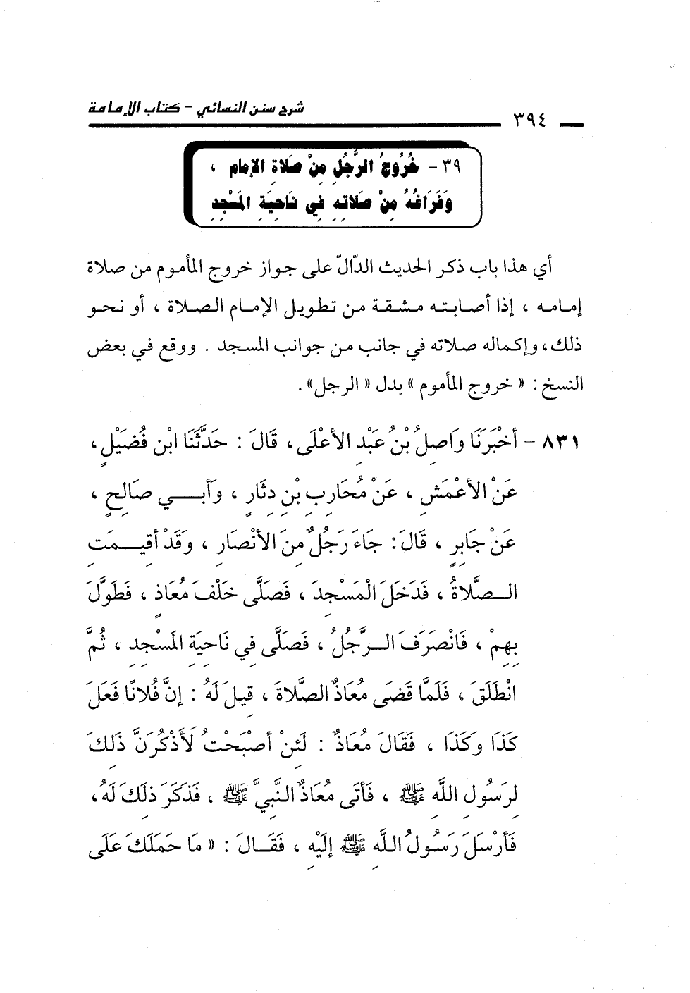 839 - أَخْبَرَنَا وَاصِلُ بْنُ عَبْدِ الأَعْلَى، قَالَ: حَدَّثَنَا ابْنُ فُضَيْلٍ، عَنِ الأَعْمَشِ، عَنْ مُحَارِبِ بْنِ دِثَارٍ، وَأَبِي صَالِحٍ، عَنْ جَابِرٍ، قَالَ: جَاءَ رَجُلٌ مِنَ الأَنْصَارِ، وَقَدْ أُقِيمَتِ الصَّلاَةُ، فَدَخَلَ الْمَسْجِدَ، فَصَلَّى خَلْفَ مُعَاذٍ، فَطَوَّلَ بِهِمْ، فَانْصَرَفَ الرَّجُلُ، فَصَلَّى فِي نَاحِيَةِ الْمَسْجِدِ، ثُمَّ انْطَلَقَ، فَلَمَّا قَضَى مُعَاذٌ الصَّلاَةَ، قِيلَ لَهُ: إِنَّ فُلاَنًا فَعَلَ كَذَا وَكَذَا، فَقَالَ مُعَاذٌ: لَئِنْ أَصْبَحْتُ لأَذْكُرَنَّ ذَلِكَ لِرَسُولِ اللَّهِ -صلى الله عليه وسلم-، فَأَتَى مُعَاذٌ النَّبِيَّ -صلى الله عليه وسلم-، فَذَكَرَ ذَلِكَ لَهُ، فَأَرْسَلَ رَسُولُ اللَّهِ -صلى الله عليه وسلم- إِلَيْهِ، فَقَالَ: "مَا حَمَلَكَ عَلَى