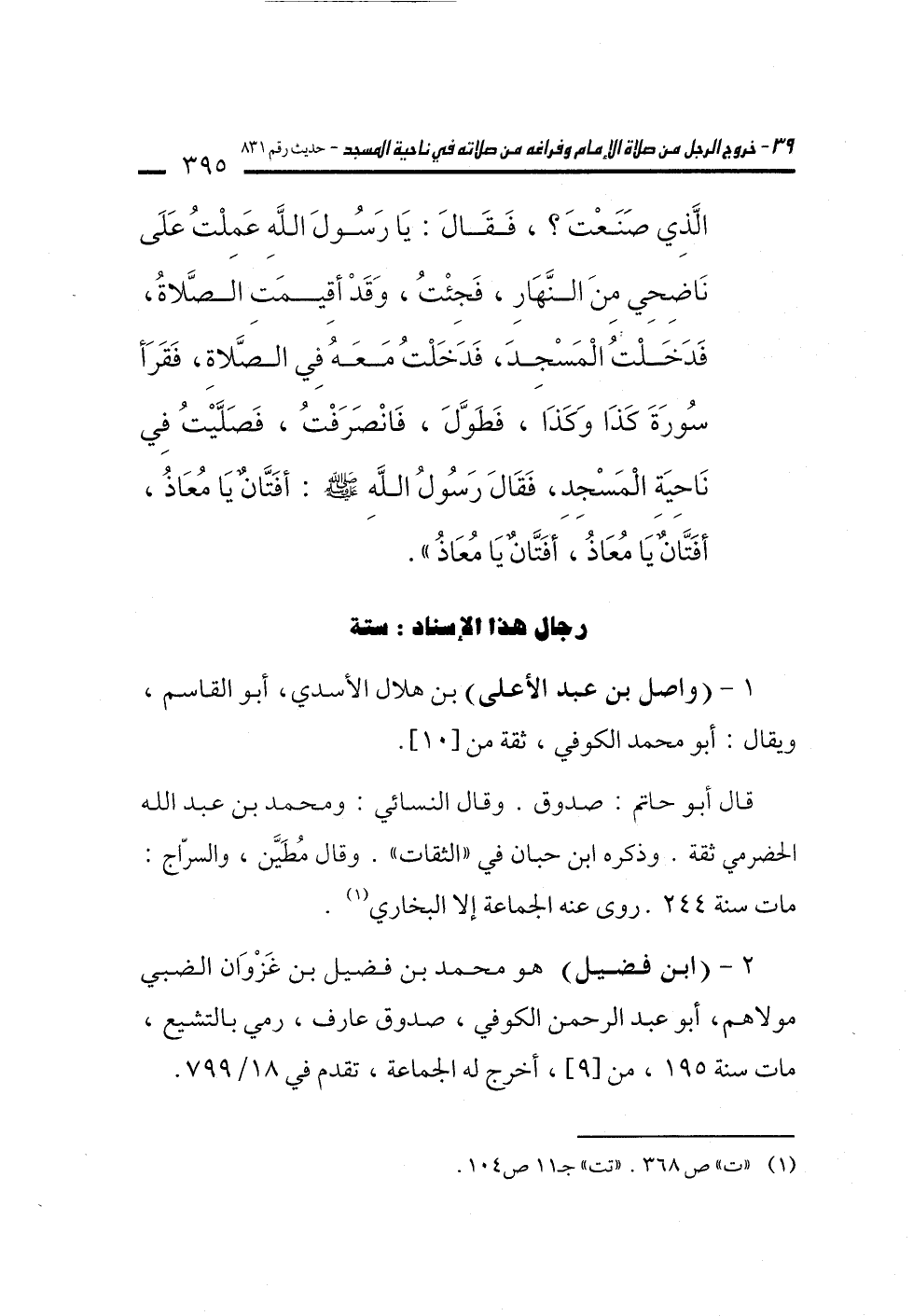 2 - (ابن فضيل) هو محمد بن فضيل بن غَزْوَان الضبي مولاهم، أبو عبد الرحمن الكوفي، صدوق عارف، رمي بالتشيع، مات سنة 195، من 91، أخرج له الجماعة، تقدم في 18/ 799.