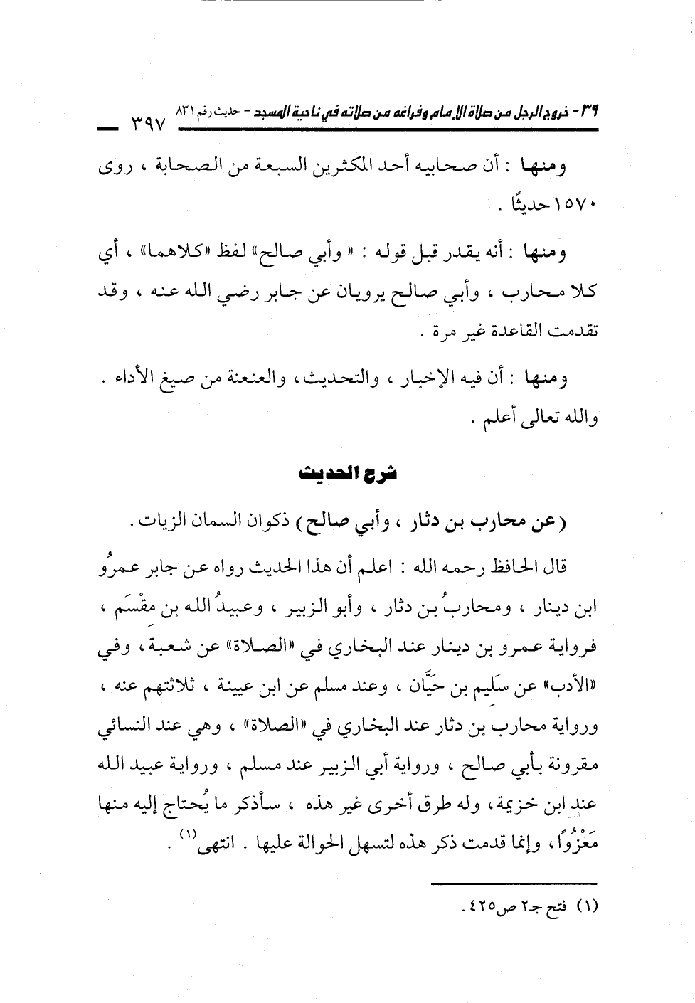 ومنها: أنه يقدر قبل قوله: "وأبي صالح" لفظ "كلاهما"، أي كلا محارب، وأبي صالح يرويان عن جابر رضي الله عنه، وقد تقدمت القاعدة غير مرة.
