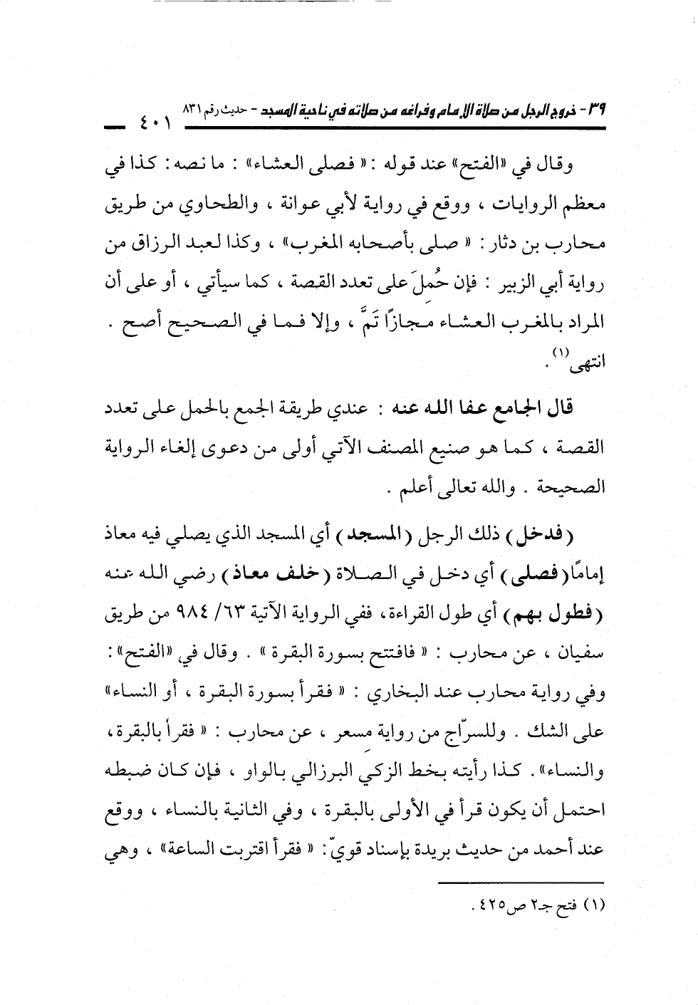 وقال في "الفتح" عند قوله: "فصلى العشاء": ما نصه: كذا في معظم الروايات، ووقع في رواية لأبي عوانة، والطحاوي من طريق محارب بن دثار: "صلى بأصحابه المغرب"، وكذا لعبد الرزاق من رواية أبي الزبير: فإن حُمِلَ على تعدد القصة، كما سيأتي، أو على أن المراد بالمغرب العشاء مجازًا تَمَّ، وإلا فما في الصحيح أصح. انتهى (¬1).