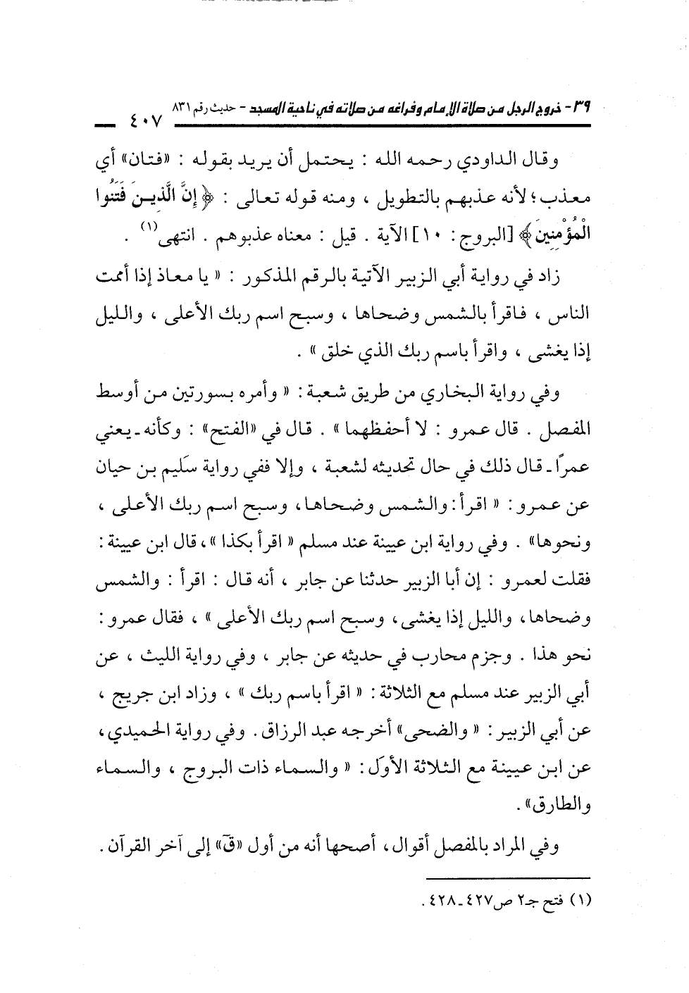 زاد في رواية أبي الزبير الآتية بالرقم المذكور: "يا معاذ إذا أممت الناس، فاقرأ بالشمس وضحاها، وسبح اسم ربك الأعلى، والليل إذا يغشى، واقرأ باسم ربك الذي خلق".
