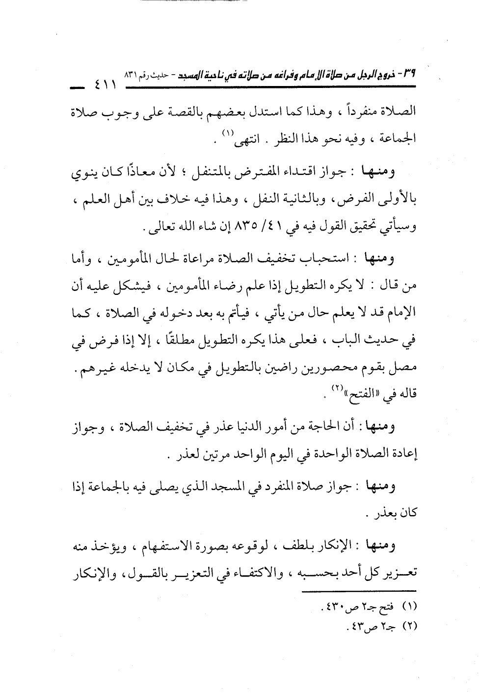 ومنها: جواز اقتداء المفترض بالمتنفل؛ لأن معاذًا كان ينوي بالأولى الفرض، وبالثانية النفل، وهذا فيه خلاف بين أهل العلم، وسيأتي تحقيق القول فيه في 41/ 835 إن شاء الله تعالى.