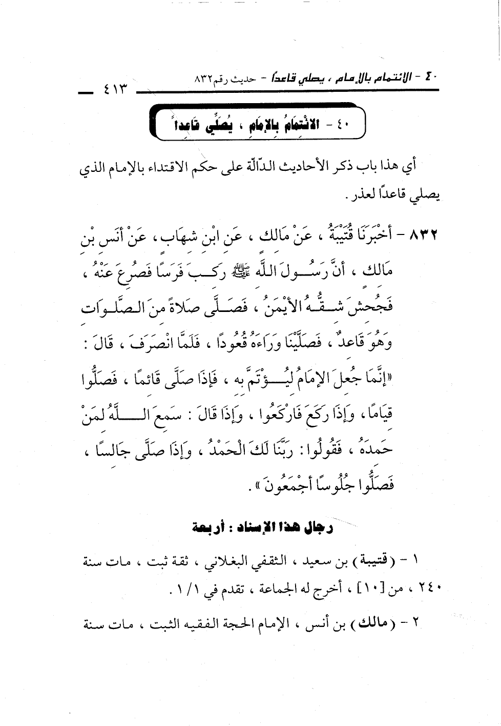832 - أَخْبَرَنَا قُتَيْبَةُ، عَنْ مَالِكٍ، عَنِ ابْنِ شِهَابٍ، عَنْ أَنَسِ بْنِ مَالِكٍ، أَنَّ رَسُولَ اللَّهِ -صلى الله عليه وسلم- رَكِبَ فَرَسًا فَصُرِعَ عَنْهُ، فَجُحِشَ شِقُّهُ الأَيْمَنُ، فَصَلَّى صَلاَةً مِنَ الصَّلَوَاتِ وَهُوَ قَاعِدٌ، فَصَلَّيْنَا وَرَاءَهُ قُعُودًا، فَلَمَّا انْصَرَفَ، قَالَ: "إِنَّمَا جُعِلَ الإِمَامُ لِيُؤْتَمَّ بِهِ، فَإِذَا صَلَّى قَائِمًا، فَصَلُّوا قِيَامًا، وَإِذَا رَكَعَ فَارْكَعُوا، وَإِذَا قَالَ: سَمِعَ اللَّهُ لِمَنْ حَمِدَهُ، فَقُولُوا: رَبَّنَا لَكَ الْحَمْدُ، وَإِذَا صَلَّى جَالِسًا، فَصَلُّوا جُلُوسًا أَجْمَعُونَ".