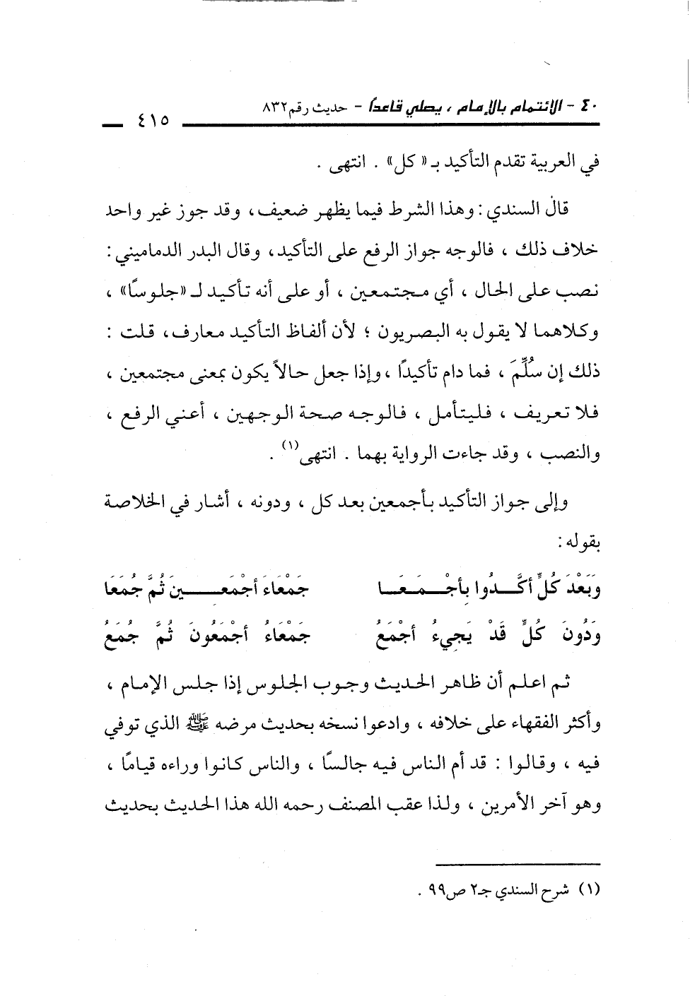 قال السندي: وهذا الشرط فيما يظهر ضعيف، وقد جوز غير واحد خلاف ذلك، فالوجه جواز الردع على التأكيد، وقال البدر الدماميني: نصب على الحال، أي مجتمعين، أو على أنه تأكيد لـ "جلوساً"، وكلاهما لا يقول به البصريون؛ لأن ألفاظ التأكيد معارف، قلت: ذلك إن سُلِّمَ، فما دام تأكيدًا، وإذا جعل حالاً يكون بمعنى مجتمعين، فلا تعريف، فليتأمل، فالوجه صحة الوجهين، أعني الرفع، والنصب، وقد جاءت الرواية بهما. انتهى (¬1).