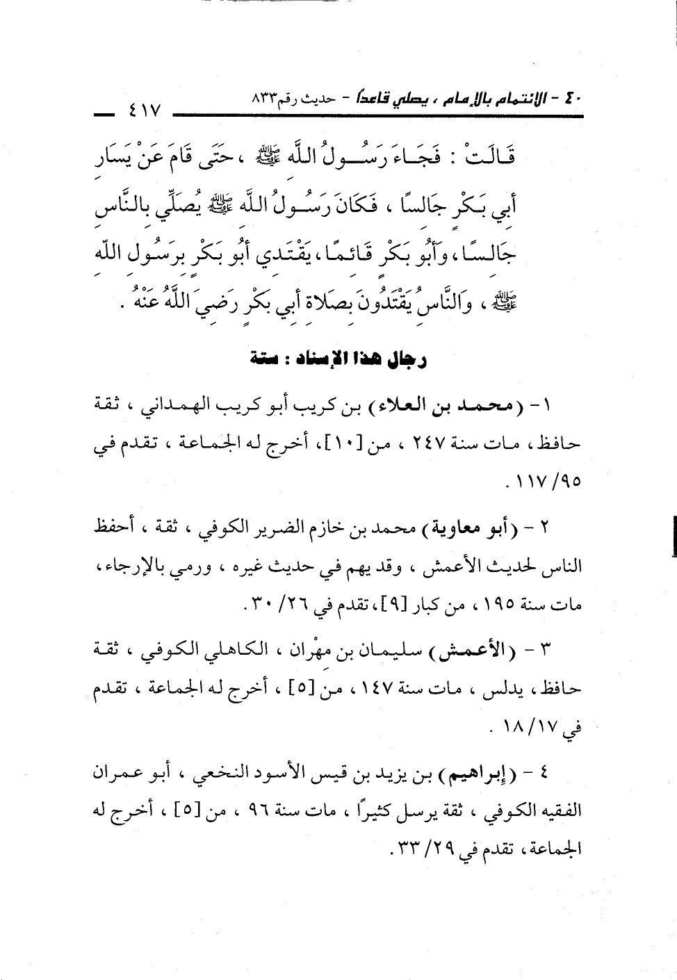 3 - (الأعمش) سليمان بن مِهْران، الكاهلي الكوفي، ثقة حافظ، يدلس، مات سنة 147، من [5] أخرج له الجماعة، تقدم في 17/ 18.