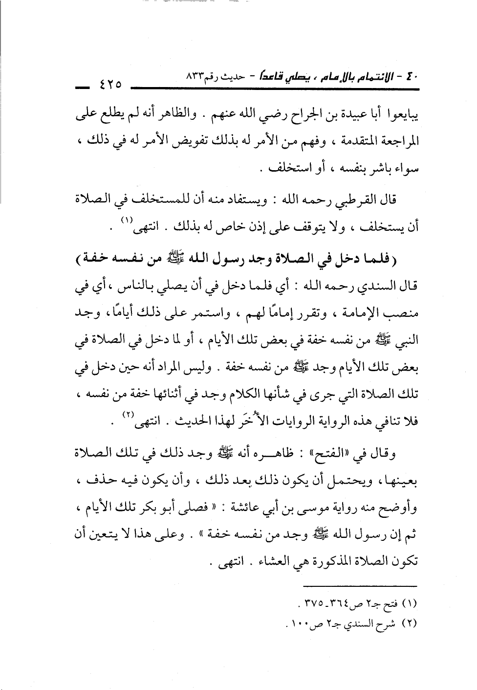 قال القرطبي رحمه الله: ويستفاد منه أن للمستخلف في الصلاة أن يستخلف، ولا يتوقف على إذن خاص له بذلك. انتهى (¬1).