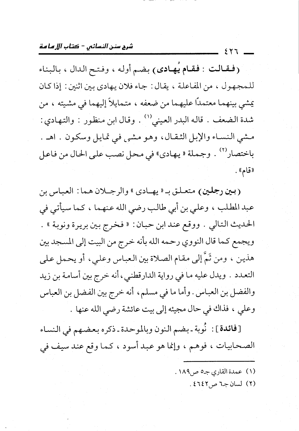 (بين رجلين) متعلق بـ "يهادى" والرجلان هما: العباس بن عبد المطلب، وعلي بن أبي طالب رضي الله عنهما، كما سيأتي في الحديث التالي. ووقع عند ابن حبان: "فخرج بين بريرة ونوبة". ويجمع كما قال النووي رحمه الله بأنه خرج من البيت إلى المسجد بين هذين، ومن ثَمَّ إلى مقام الصلاة بين العباس وعلي، أو يحمل على التعدد، ويدل عليه ما في رواية الدارقطني، أنه خرج بين أسامة بن زيد والفضل بن العباس. وأما ما في مسلم، أنه خرج بين الفضل بن العباس وعلي، فذاك في حال مجيئه إلى بيت عائشة رضي الله عنها.