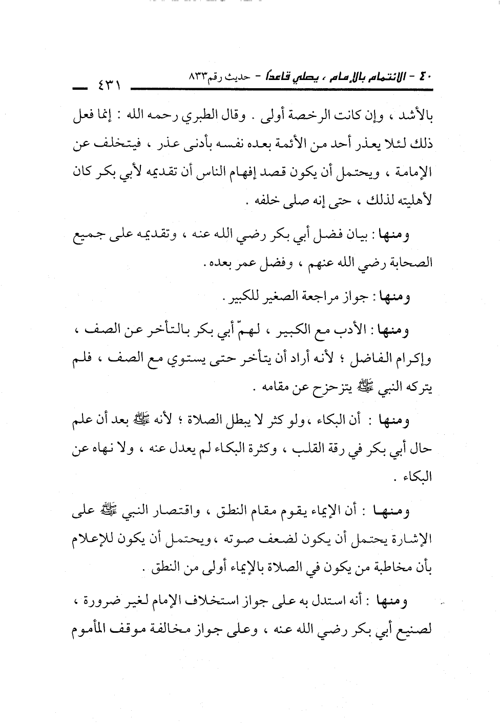 ومنها: أن البكاء، ولو كثر لا يبطل الصلاة؛ لأنه -صلى الله عليه وسلم- بعد أن علم حال أبي بكر في رقة القلب، وكثرة البكاء لم يعدل عنه، ولا نهاه عن البكاء.
