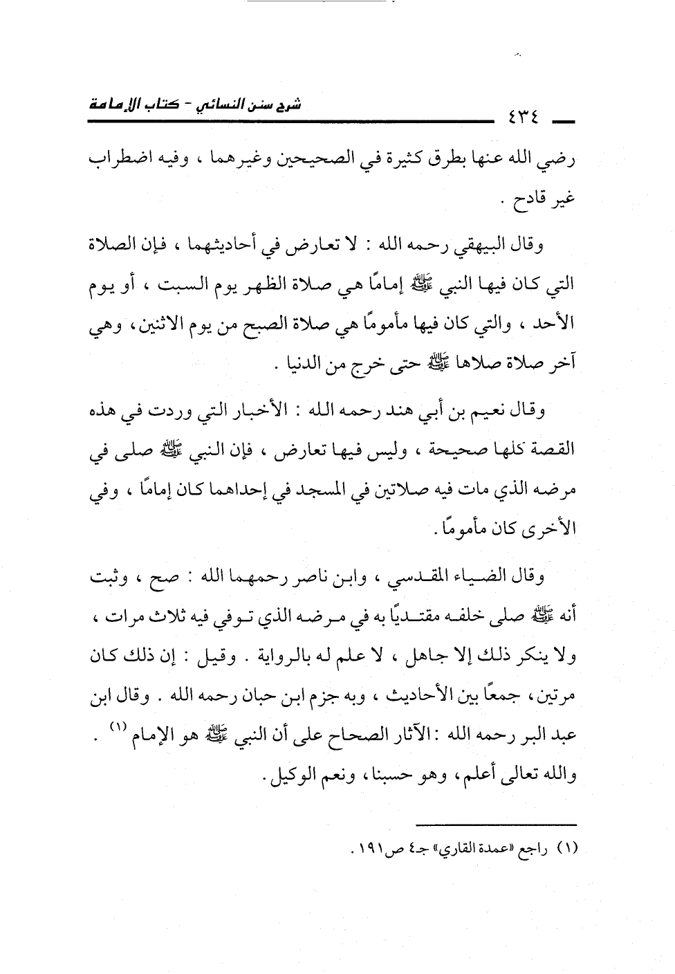 وقال الضياء المقدسي، وابن ناصر رحمهما الله: صح، وثبت أنه -صلى الله عليه وسلم- صلى خلفه مقتديًا به في مرضه الذي توفي فيه ثلاث مرات، ولا ينكر ذلك إلا جاهل، لا علم له بالرواية. وقيل: إن ذلك كان مرتين، جمعًا بين الأحاديث، وبه جزم ابن حبان رحمه الله. وقال ابن عبد البر رحمه الله: الآثار الصحاح على أن النبي -صلى الله عليه وسلم- هو الإِمام (¬1). والله تعالى أعلم، وهو حسبنا، ونعم الوكيل.