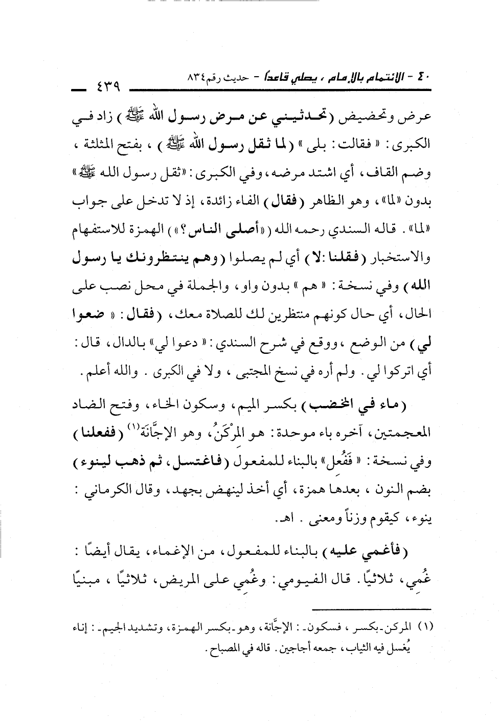 عرض وتحضيض (تحدثيني عن مرض رسول الله -صلى الله عليه وسلم-) زاد في الكبرى: "فقالت: بلى" (لما ثقل رسول الله -صلى الله عليه وسلم-)، بفتح المثلثة، وضم القاف، أي اشتد مرضه، وفي الكبرى: "ثقل رسول الله -صلى الله عليه وسلم-" بدون "لما"، وهو الظاهر (فقال) الفاء زائدة، إذ لا تدخل على جواب "لما". قاله السندي رحمه الله ("أصلى الناس؟ ") الهمزة للاستفهام والاستخبار (فقلنا: لا) أي لم يصلوا (وهم ينتظرونك يا رسول الله) وفي نسخة: "هم" بدون واو، والجملة في محل نصب على الحال، أي حال كونهم منتظرين لك للصلاة معك، (فقال: "ضعوا لي) من الوضع، ووقع في شرح السندي: "دعوا لي" بالدال، قال: أي اتركوا لي. ولم أره في نسخ المجتبى، ولا في الكبرى. والله أعلم.