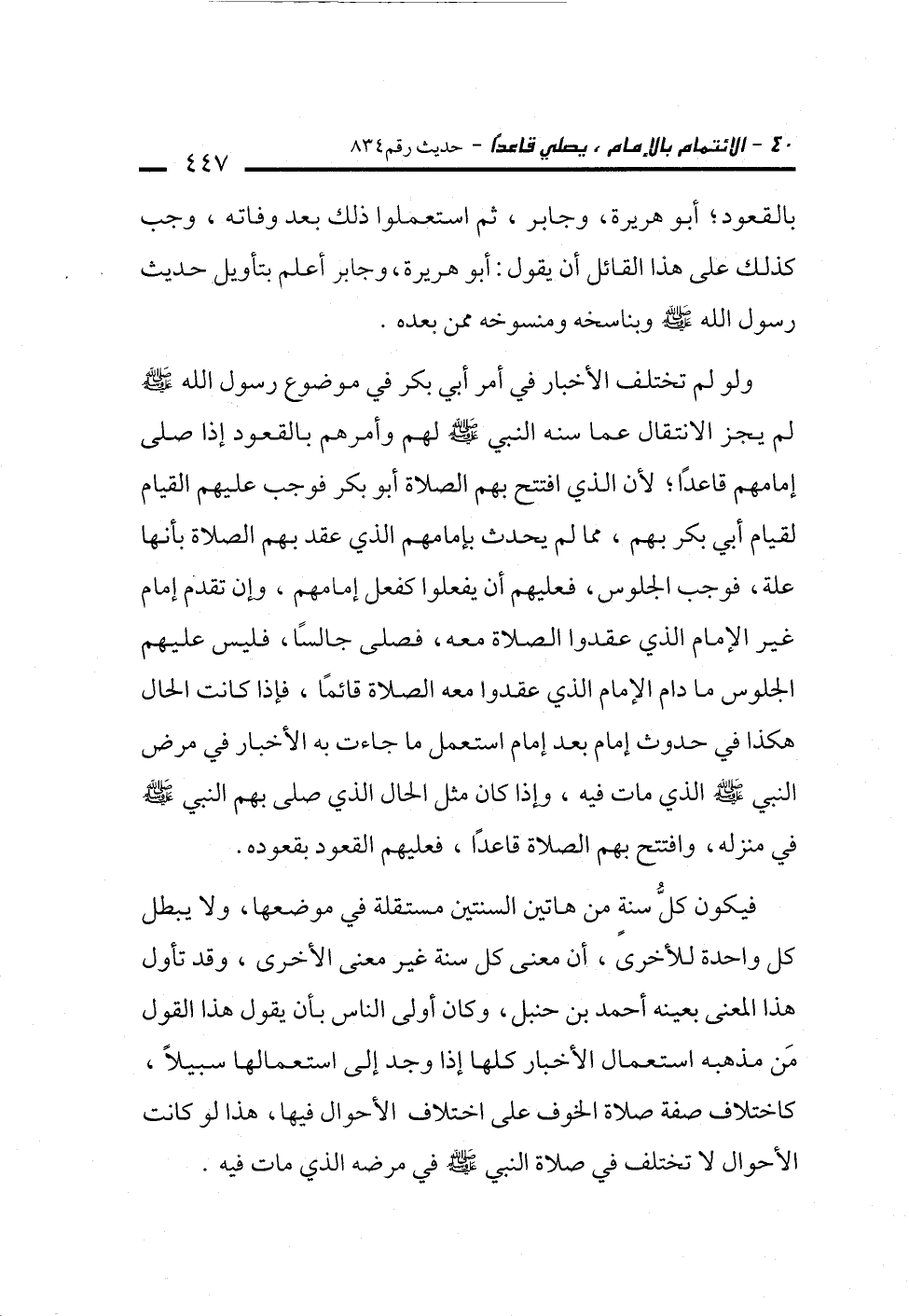 ولو لم تختلف الأخبار في أمر أبي بكر في موضوع رسول الله -صلى الله عليه وسلم- لم يجز الانتقال عما سنه النبي -صلى الله عليه وسلم- لهم وأمرهم بالقعود إذا صلى إمامهم قاعدًا؛ لأن الذي افتتح بهم الصلاة أبو بكر فوجب عليهم القيام لقيام أبي بكر بهم، مما لم يحدث بإمامهم الذي عقد بهم الصلاة بأنها علة، فوجب الجلوس، فعليهم أن يفعلوا كفعل إمامهم، وإن تقدم إمام غير الإِمام الذي عقدوا الصلاة معه، فصلى جالسًا، فليس عليهم الجلوس ما دام الإِمام الذي عقدوا معه الصلاة قائمًا، فإذا كانت الحال هكذا في حدوث إمام بعد إمام استعمل ما جاءت به الأخبار في مرض النبي -صلى الله عليه وسلم- الذي مات فيه، وإذا كان مثل الحال الذي صلى بهم النبي -صلى الله عليه وسلم- في منزله، وافتتح بهم الصلاة قاعدًا، فعليهم القعود بقعوده.