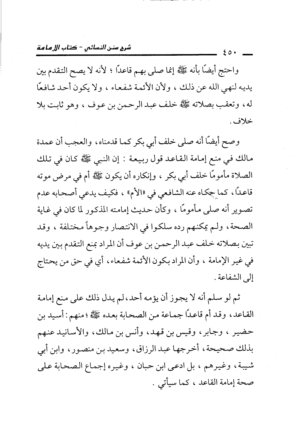 واحتج أيضًا بأنه -صلى الله عليه وسلم- إنما صلى بهم قاعدًا؛ لأنه لا يصح التقدم بين يديه لنهي الله عن ذلك، ولأن الأئمة شفعاء، ولا يكون أحد شافعًا له، وتعقب بصلاته -صلى الله عليه وسلم- خلف عبد الرحمن بن عوف، وهو ثابت بلا خلاف.