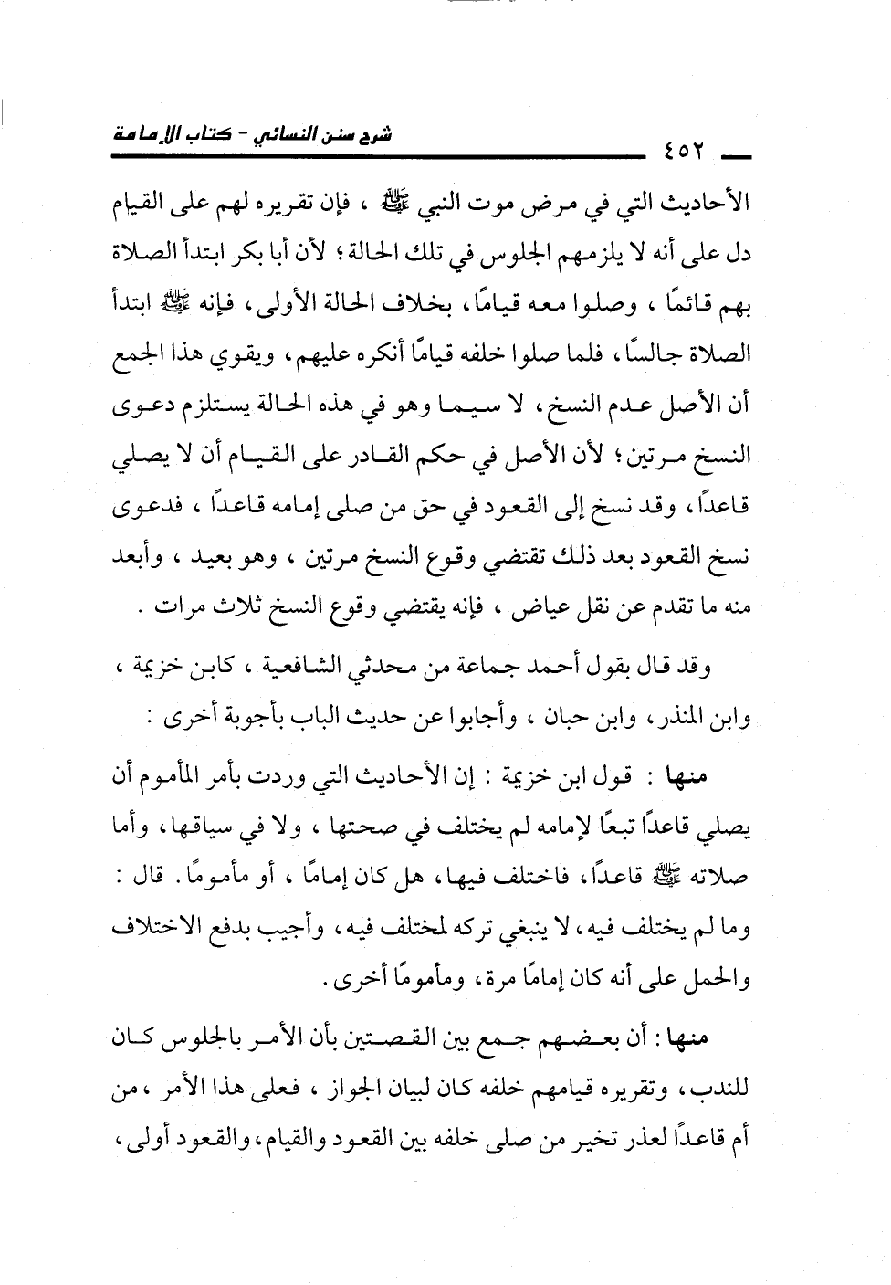 الأحاديث التي في مرض موت النبي -صلى الله عليه وسلم-، فإن تقريره لهم على القيام دل على أنه لا يلزمهم الجلوس في تلك الحالة؛ لأن أبا بكر ابتدأ الصلاة بهم قائمًا، وصلوا معه قيامًا، بخلاف الحالة الأولى، فإنه -صلى الله عليه وسلم- ابتدأ الصلاة جالسًا، فلما صلوا خلفه قيامًا أنكره عليهم، ويقوي هذا الجمع أن الأصل عدم النسخ، لاسيما وهو في هذه الحالة يستلزم دعوى النسخ مرتين؛ لأن الأصل في حكم القادر على القيام أن لا يصلي قاعدًا، وقد نسخ إلى القعود في حق من صلى إمامه قاعدًا، فدعوى نسخ القعود بعد ذلك تقتضي وقوع النسخ مرتين، وهو بعيد، وأبعد منه ما تقدم عن نقل عياض، فإنه يقتضي وقوع النسخ ثلاث مرات.