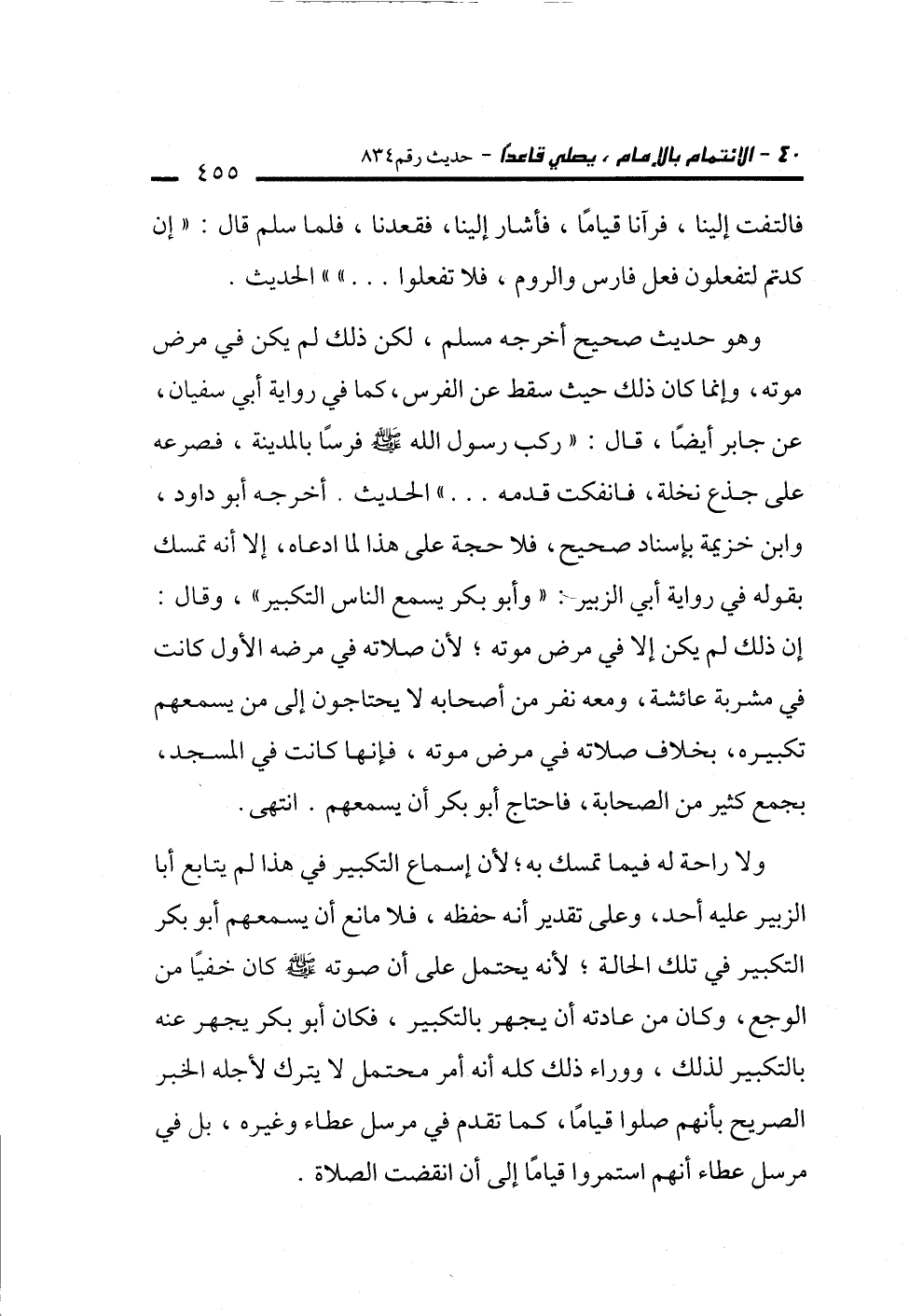 وهو حديث صحيح أخرجه مسلم، لكن ذلك لم يكن في مرض موته، وإنما كان ذلك حيث سقط عن الفرس، كما في رواية أبي سفيان، عن جابر أيضًا، قال: "ركب رسول الله -صلى الله عليه وسلم- فرسًا بالمدينة، فصرعه على جذع نخلة، فانفكت قدمه ... " الحديث. أخرجه أبو داود، وابن خزيمة بإسناد صحيح، فلا حجة على هذا لما ادعاه، إلا أنه تمسك بقوله في رواية أبي الزبير: "وأبو بكر يسمع الناس التكبير"، وقال: إن ذلك لم يكن إلا في مرض موته؛ لأن صلاته في مرضه الأول كانت في مشربة عائشة، ومعه نفر من أصحابه لا يحتاجون إلى من يسمعهم تكبيره، بخلاف صلاته في مرض موته، فإنها كانت في المسجد، بجمع كثير من الصحابة، فاحتاج أبو بكر أن يسمعهم. انتهى.