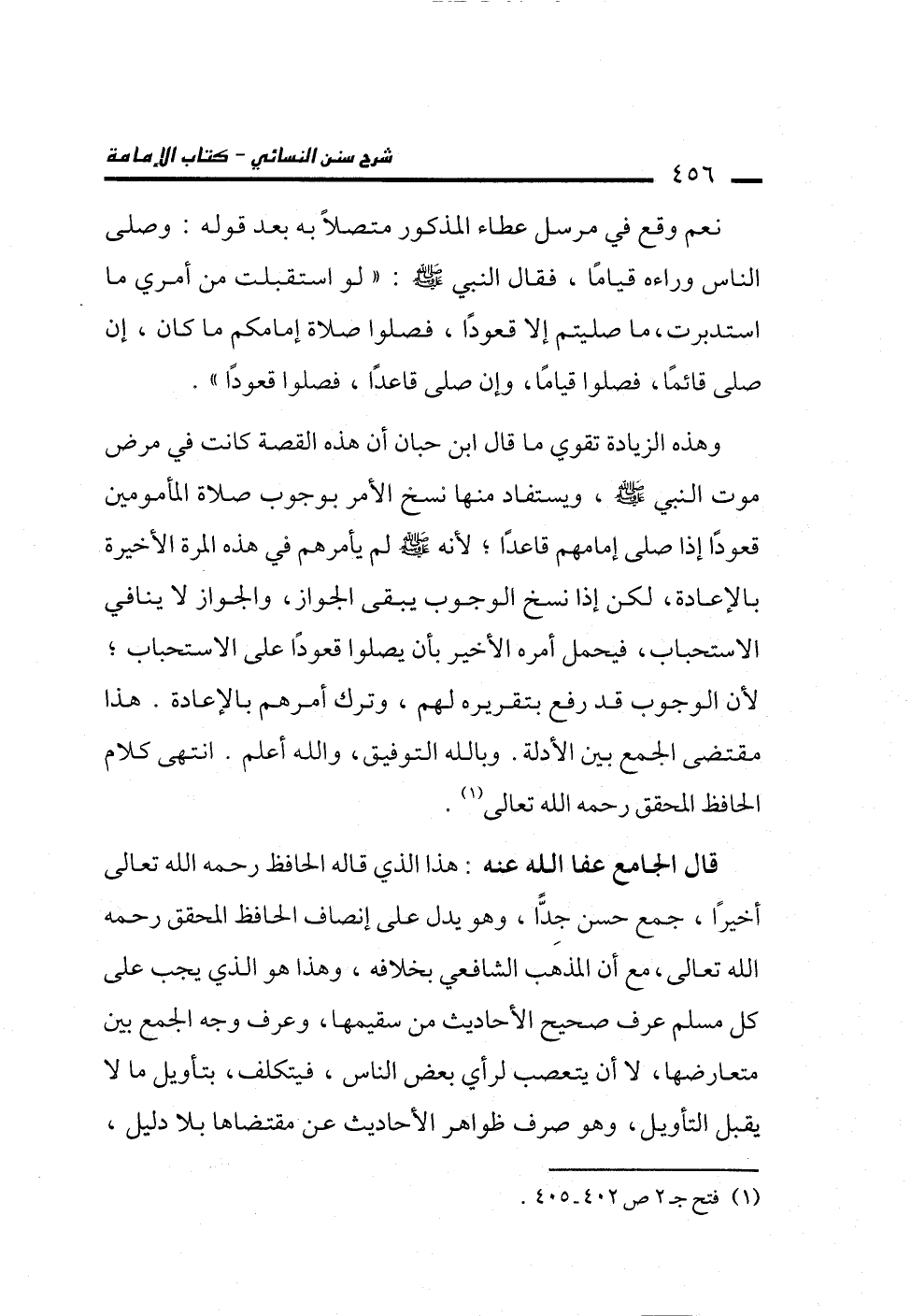 وهذه الزيادة تقوي ما قال ابن حبان أن هذه القصة كانت في مرض موت النبي -صلى الله عليه وسلم-، ويستفاد منها نسخ الأمر بوجوب صلاة المأمومين قعودًا إذا صلى إمامهم قاعدًا؛ لأنه -صلى الله عليه وسلم- يأمرهم في هذه المرة الأخيرة بالإعادة، لكن إذا نسخ الوجوب يبقى الجواز، والجواز لا ينافي الاستحباب، فيحمل أمره الأخير أن يصلوا قعودًا على الاستحباب؛ لأن الوجوب قد رفع بتقريره لهم، وترك أمرهم بالإعادة. هذا مقتضى الجمع بين الأدلة. وبالله التوفيق، والله أعلم. انتهى كلام الحافظ المحقق رحمه الله تعالى (¬1).