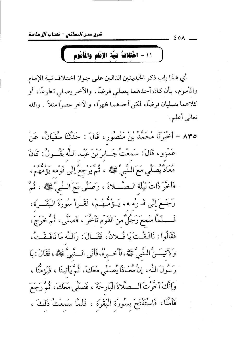 835 - أَخْبَرَنَا مُحَمَّدُ بْنُ مَنْصُورٍ، قَالَ: حَدَّثَنَا سُفْيَانُ، عَنْ عَمْرٍو، قَالَ: سَمِعْتُ جَابِرَ بْنَ عَبْدِ اللَّهِ يَقُولُ: كَانَ مُعَاذٌ يُصَلِّي مَعَ النَّبِيِّ -صلى الله عليه وسلم-، ثُمَّ يَرْجِعُ إِلَى قَوْمِهِ يَؤُمُّهُمْ، فَأَخَّرَ ذَاتَ لَيْلَةٍ الصَّلاَةَ، وَصَلَّى مَعَ النَّبِيِّ -صلى الله عليه وسلم-، ثُمَّ رَجَعَ إِلَى قَوْمِهِ، يَؤُمُّهُمْ، فَقَرَأَ سُورَةَ الْبَقَرَةِ، فَلَمَّا سَمِعَ رَجُلٌ مِنَ الْقَوْمِ تَأَخَّرَ، فَصَلَّى، ثُمَّ خَرَجَ، فَقَالُوا: نَافَقْتَ يَا فُلاَنُ، فَقَالَ: وَاللَّهِ مَا نَافَقْتُ، وَلآتِيَنَّ النَّبِيَّ -صلى الله عليه وسلم-، فَأُخْبِرُهُ، فَأَتَى النَّبِيَّ -صلى الله عليه وسلم-، فَقَالَ: يَا رَسُولَ اللَّهِ، إِنَّ مُعَاذًا يُصَلِّي مَعَكَ، ثُمَّ يَأْتِينَا، فَيَؤُمُّنَا، وَإِنَّكَ أَخَّرْتَ الصَّلاَةَ الْبَارِحَةَ، فَصَلَّى مَعَكَ، ثُمَّ رَجَعَ فَأَمَّنَا، فَاسْتَفْتَحَ بِسُورَةِ الْبَقَرَةِ، فَلَمَّا سَمِعْتُ ذَلِكَ،