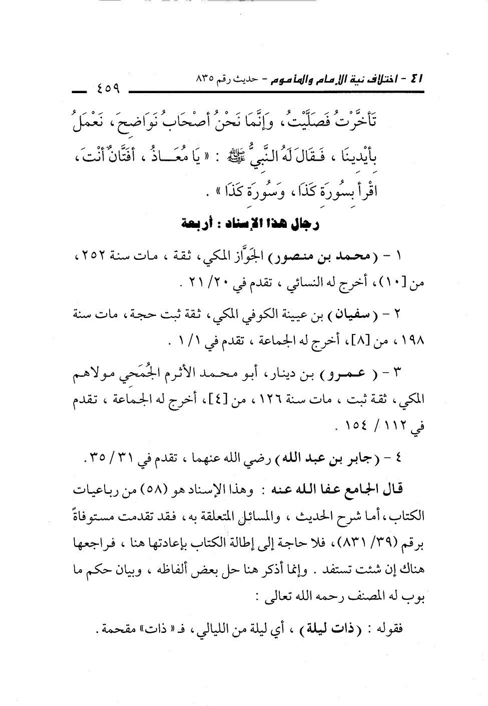 قال الجامع عفا الله عنه: وهذا الإسناد هو (58) من رباعيات الكتاب، أما شرح الحديث، والمسائل المتعلقة له، فقد تقدمت مستوفاةً برقم (39/ 831)، فلا حاجة إلى إطالة الكتاب بإعادتهاهنا، فراجعهاهناك إن شئت تستفد. وإنما أذكر هنا حل بعض ألفاظه، وبيان حكم ما بوب له المصنف رحمه الله تعالى: