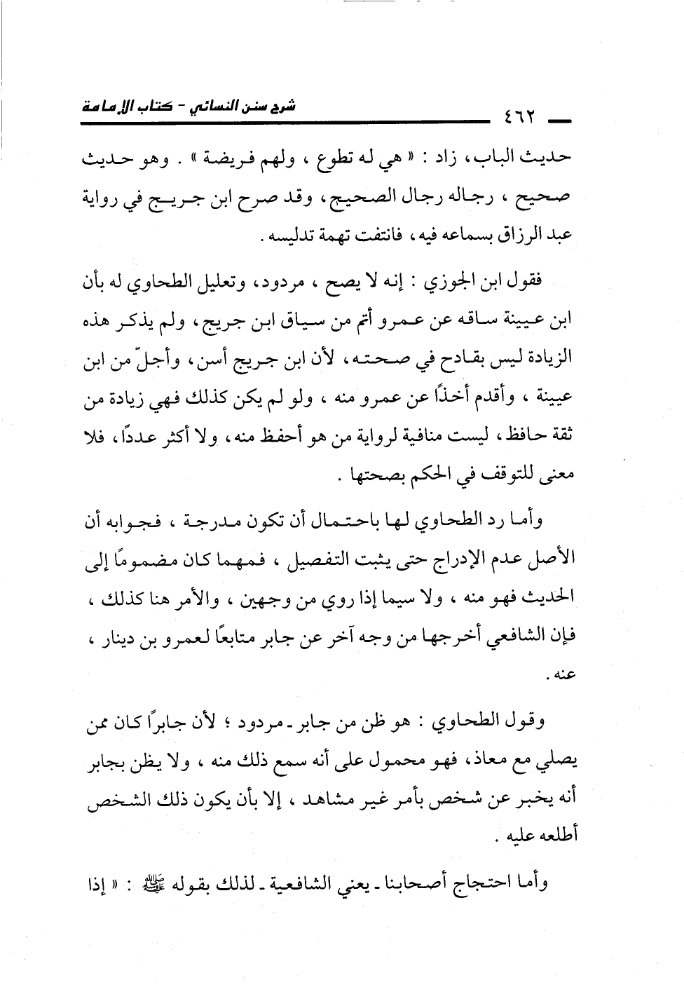 وأما رد الطحاوي لها باحتمال أن تكون مدرجة، فجوابه أن الأصل عدم الإدراج حتى يثبت التفصيل، فمهما كان مضمومًا إلى الحديث فهو منه، ولاسيما إذا روي من وجهين، والأمر هنا كذلك، فإن الشافعي أخرجها من وجه آخر عن جابر متابعًا لعمرو بن دينار، عنه.
