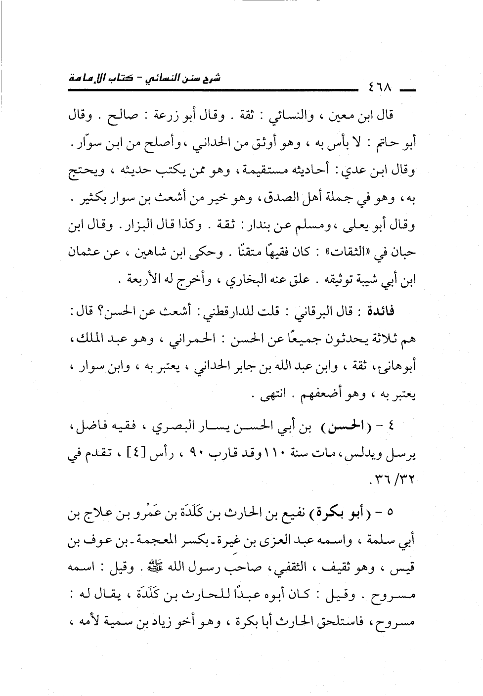 فائدة: قال البرقاني: قلت للدارقطني. أشعث عن الحسن؟ قال: هم ثلاثة يحدثون جميعًا عن الحسن: الحمراني، وهو عبد الملك، أبو هانىء، ثقة، وابن عبد الله بن جابر الحداني، يعتبر به، وابن سوار، يعتبر به، وهو أضعفهم، انتهى.