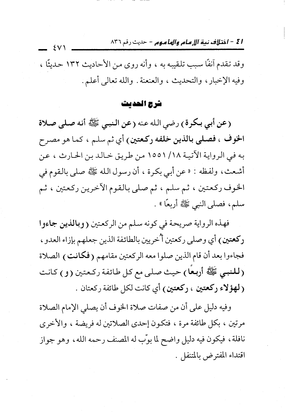 (عن أبي بكرة) رضي الله عنه (عن النبي -صلى الله عليه وسلم- أنه صلى صلاة الخوف، فصلى بالذين خلفه ركعتين) أي ثم سلم، كما هو مصرح به في الرواية الآتية 18/ 1551 من طريق خالد بن الحارث، عن أشعث، ولفظه: "عن أبي بكرة، أن رسول الله -صلى الله عليه وسلم- صلى بالقوم في الخوف ركعتين، ثم سلم، ثم صلى بالقوم الآخرين ركعتين، ثم سلم، فصلى النبي -صلى الله عليه وسلم- أربعًا".