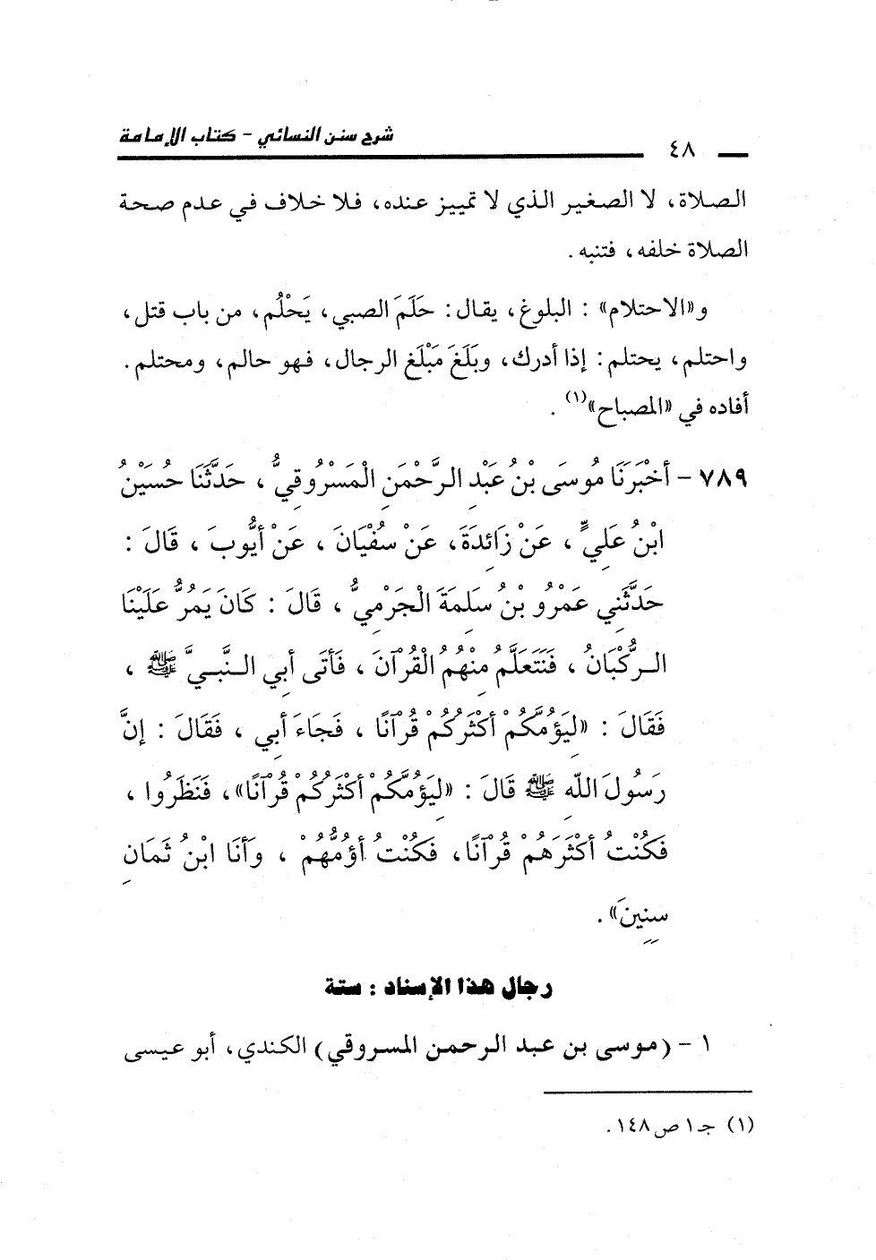 789 - أَخْبَرَنَا مُوسَى بْنُ عَبْدِ الرَّحْمَنِ الْمَسْرُوقِيُّ، حَدَّثَنَا حُسَيْنُ بْنُ عَلِيٍّ، عَنْ زَائِدَةَ، عَنْ سُفْيَانَ، عَنْ أَيُّوبَ، قَالَ: حَدَّثَنِي عَمْرُو بْنُ سَلِمَةَ الْجَرْمِيُّ، قَالَ: كَانَ يَمُرُّ عَلَيْنَا الرُّكْبَانُ، فَنَتَعَلَّمُ مِنْهُمُ الْقُرْآنَ، فَأَتَى أَبِي النَّبِيَّ -صلى الله عليه وسلم-، فَقَالَ: "لِيَؤُمَّكُمْ أَكْثَرُكُمْ قُرْآنًا، فَجَاءَ أَبِي، فَقَالَ: إِنَّ رَسُولَ اللَّهِ -صلى الله عليه وسلم- قَالَ: "لِيَؤُمَّكُمْ أَكْثَرُكُمْ قُرْآنًا"، فَنَظَرُوا، فَكُنْتُ أَكْثَرَهُمْ قُرْآنًا، فَكُنْتُ أَؤُمُّهُمْ، وَأَنَا ابْنُ ثَمَانِ سِنِينَ".