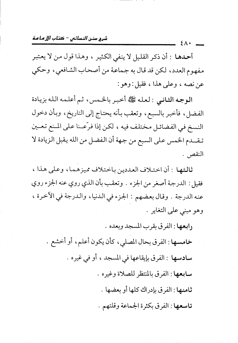 الوجه الثاني: لعله -صلى الله عليه وسلم- أخبر بالخمس، ثم أعلمه الله بزيادة الفضل، فأخبر بالسبع، وتعقب بأنه يحتاج إلى التاريخ، وبأن دخول النسخ في الفضائل مختلف فيه، لكن إذا فرّعنا على المنع تعين تقدم الخمس على السبع من جهة أن الفضل من الله يقبل الزيادة لا النقص.