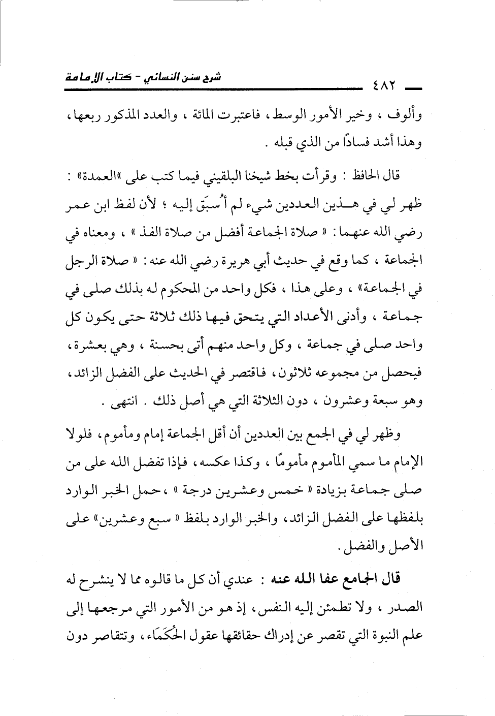 وظهر لي في الجمع بين العددين أن أقل الجماعة إمام ومأموم، فلولا الإِمام ما سمي المأموم مأمومًا، وكذا عكسه، فإذا تفضل الله على من صلى جماعة بزيادة "خمس وعشرين درجة"، حمل الخبر الوارد بلفظها على الفضل الزائد، والخبر الوارد للفظ "سبع وعشرين" على الأصل والفضل.
