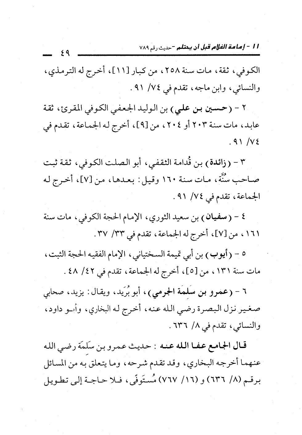 قال الجامع عفا الله عنه: حديث عمرو بن سَلِمَة رضي الله عنهما أخرجه البخاري، وقد تقدم شرحه، وما يتعلق به من المسائل برقم (8/ 636) و (16/ 767) مُستَوفًى، فلا حاجة إلى تطويل