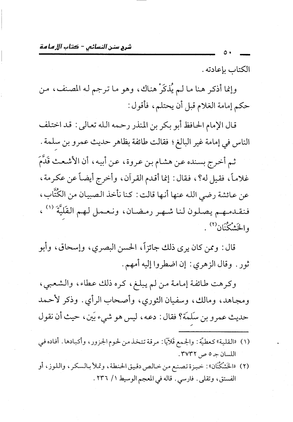 ثم أخرج بسنده عن هشام بن عروة، عن أبيه، أن الأشعث قَدَّمَ غلاماً، فقيل له؟، فقال: إنما أقدم القرآن، وأخرج أيضاً عن عكرمة، عن عائشة رضي الله عنها أنها قالت: كنا نأخذ الصبيان من الكُتَّاب، فنقدمهم يصلون لنا شهر رمضان، ونعمل لهم القَلِيَّةَ (¬1)، والخَشْكُنَان (¬2).