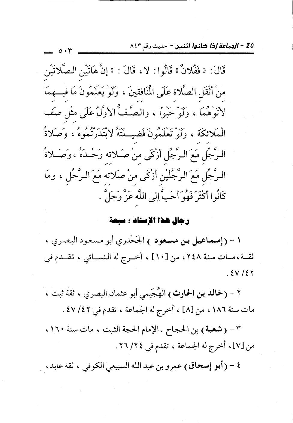 قَالَ: "فَفُلاَنٌ". قَالُوا: لاَ، قَالَ: "إِنَّ هَاتَيْنِ الصَّلاَتَيْنِ مِنْ أَثْقَلِ الصَّلاَةِ عَلَى الْمُنَافِقِينَ، وَلَوْ يَعْلَمُونَ مَا فِيهِمَا لأَتَوْهُمَا، وَلَوْ حَبْوًا، وَالصَّفُّ الأَوَّلُ عَلَى مِثْلِ صَفِّ الْمَلاَئِكَةِ، وَلَوْ تَعْلَمُونَ فَضِيلَتَهُ لاَبْتَدَرْتُمُوهُ، وَصَلاَةُ الرَّجُلِ مَعَ الرَّجُلِ أَزْكَى مِنْ صَلاَتِهِ وَحْدَهُ، وَصَلاَةُ الرَّجُلِ مَعَ الرَّجُلَيْنِ أَزْكَى مِنْ صَلاَتِهِ مَعَ الرَّجُلِ، وَمَا كَانُوا أَكْثَرَ فَهُوَ أَحَبُّ إِلَى اللَّهِ عَزَّ وَجَلَّ.